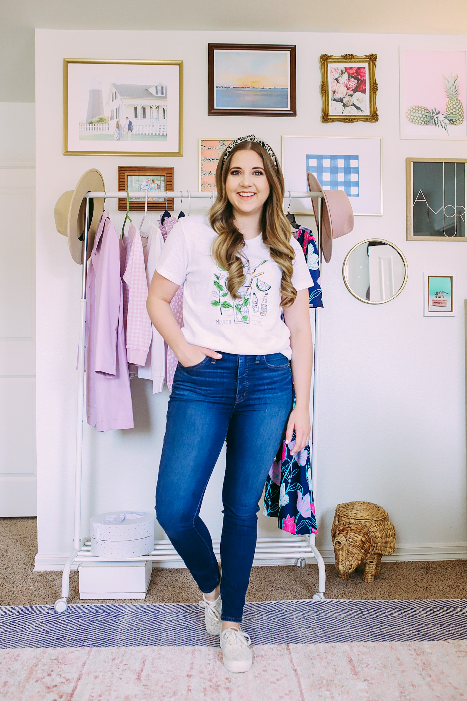 Even when we aren’t stuck inside I wear graphic t-shirts all the time. For these looks, I am wearing a cocktail graphic tee, but it can be anything! Here are some of my favorite graphic t-shirts.