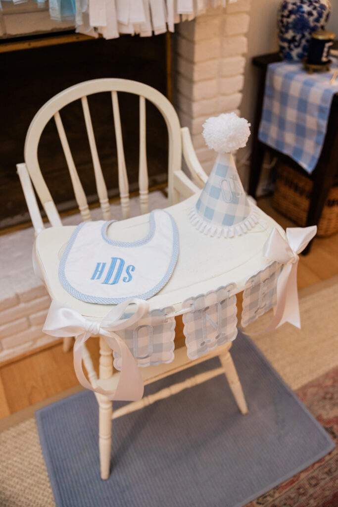 - Personalized High Chair – Add a custom gingham high chair banner with “ONE” in embroidered letters for the perfect smash cake moment.