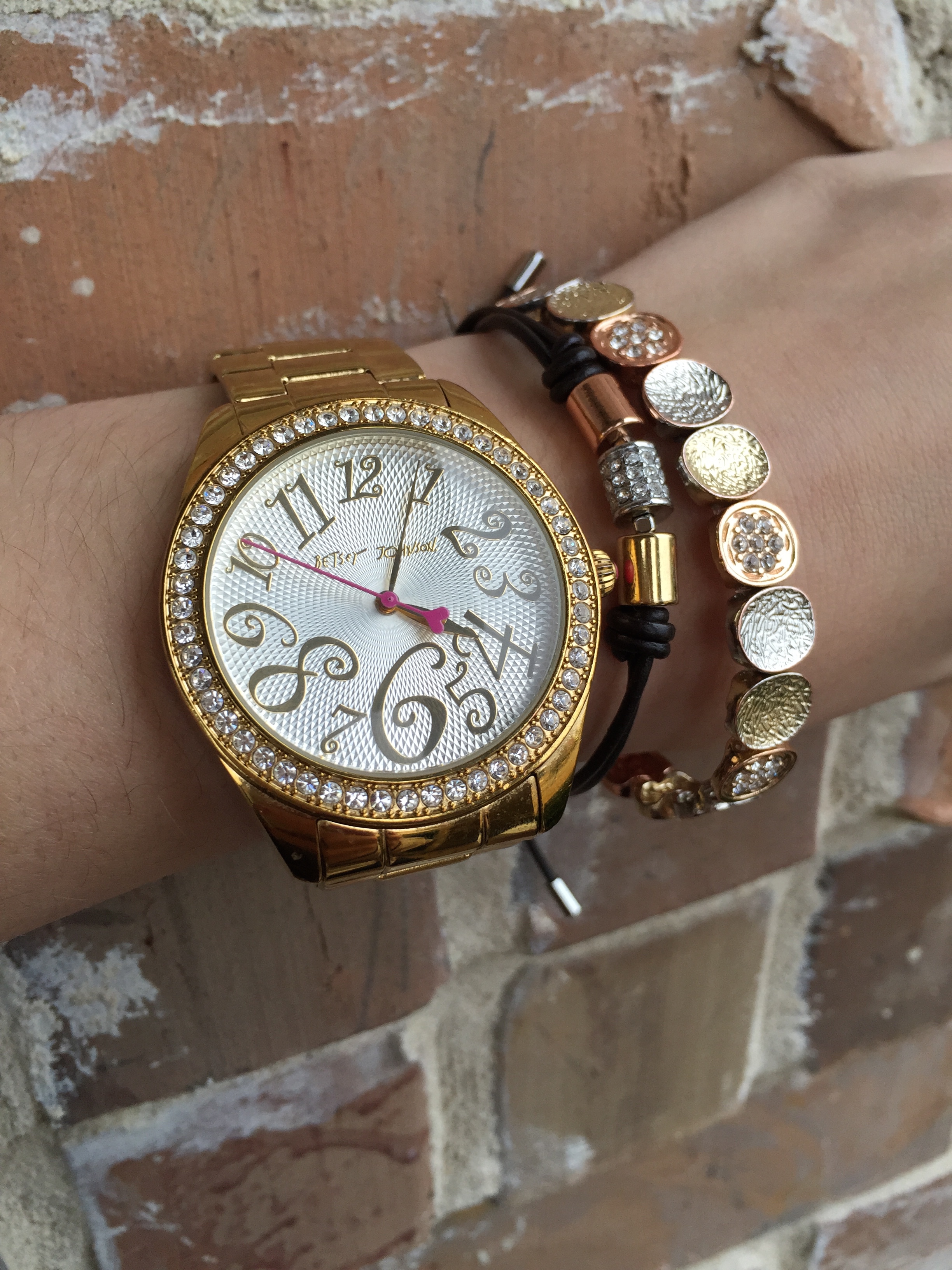 Glam it up with gold! Gold is my go to and when I want a heavy stack I reach for these pieces. Have one chunky piece to balance out the lighter ones! Personally, I like to work in odds so a small stack for me is 3 and big stack is 5… I’ve never been brave enough to try 7!Let the watch steal the show. I know some girls throw on several bracelets with their watch but when I wear a watch I like to keep it a max of 2 bracelets. The thinner bracelets compliment the focus of the watch without being too overbearing.