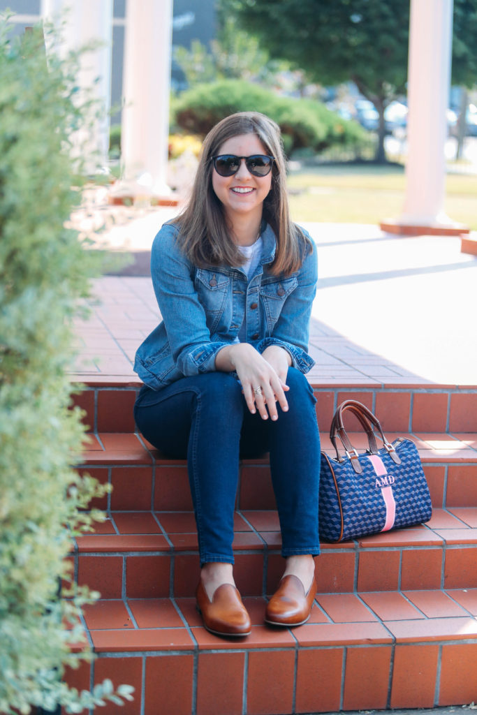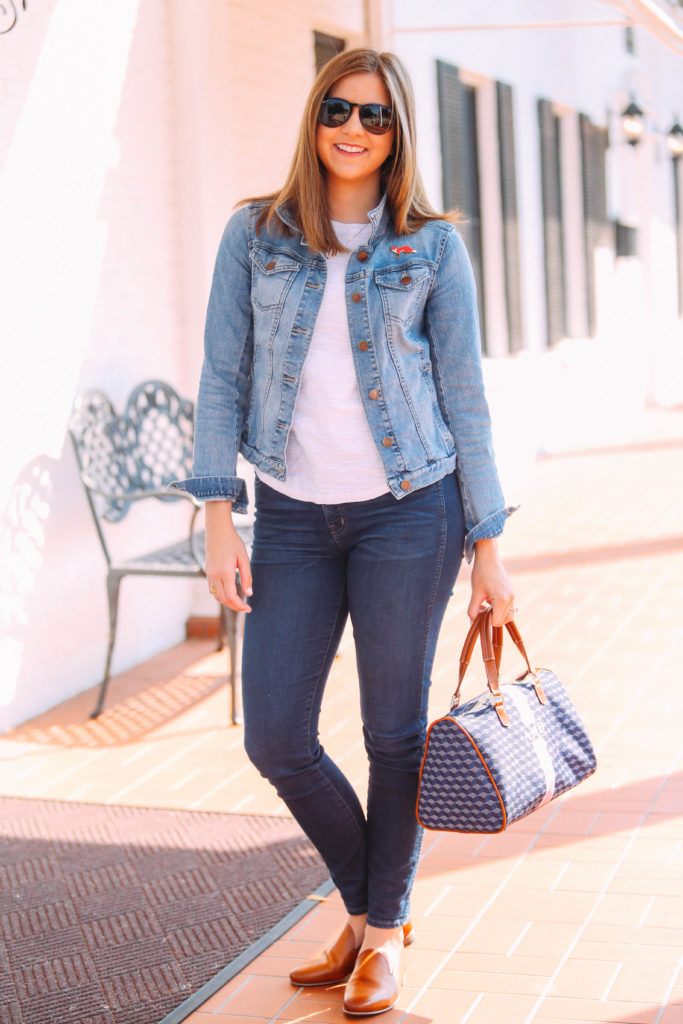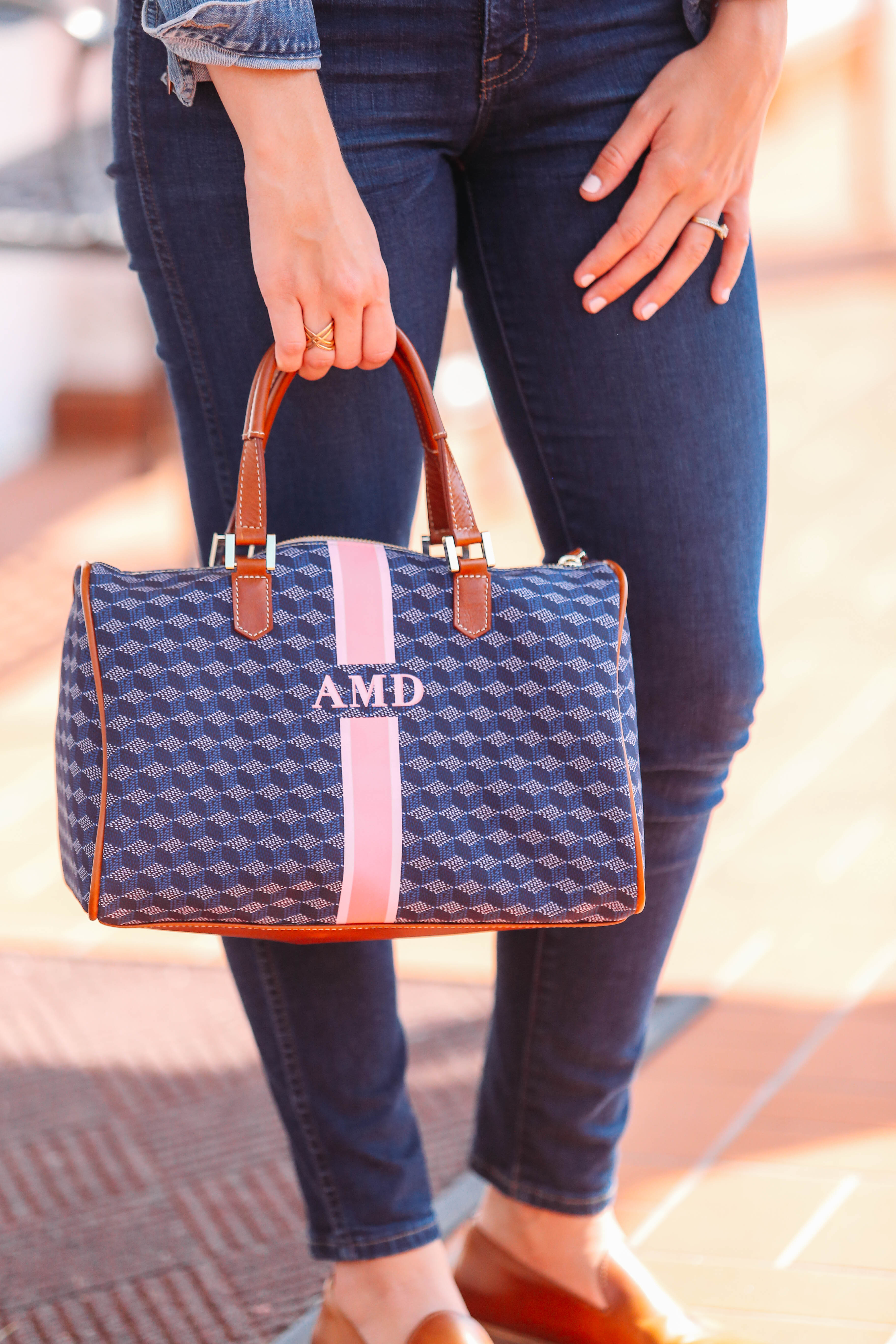 I love the navy and pink combo, because the navy makes it versatile for everyday outfits while the pink adds a fun pop of color. This will definitely be my go to bag this season. This also pairs nicely with my St. Anne Tote when I am heading to the office or traveling, since that totes is so neutral and has navy accents.