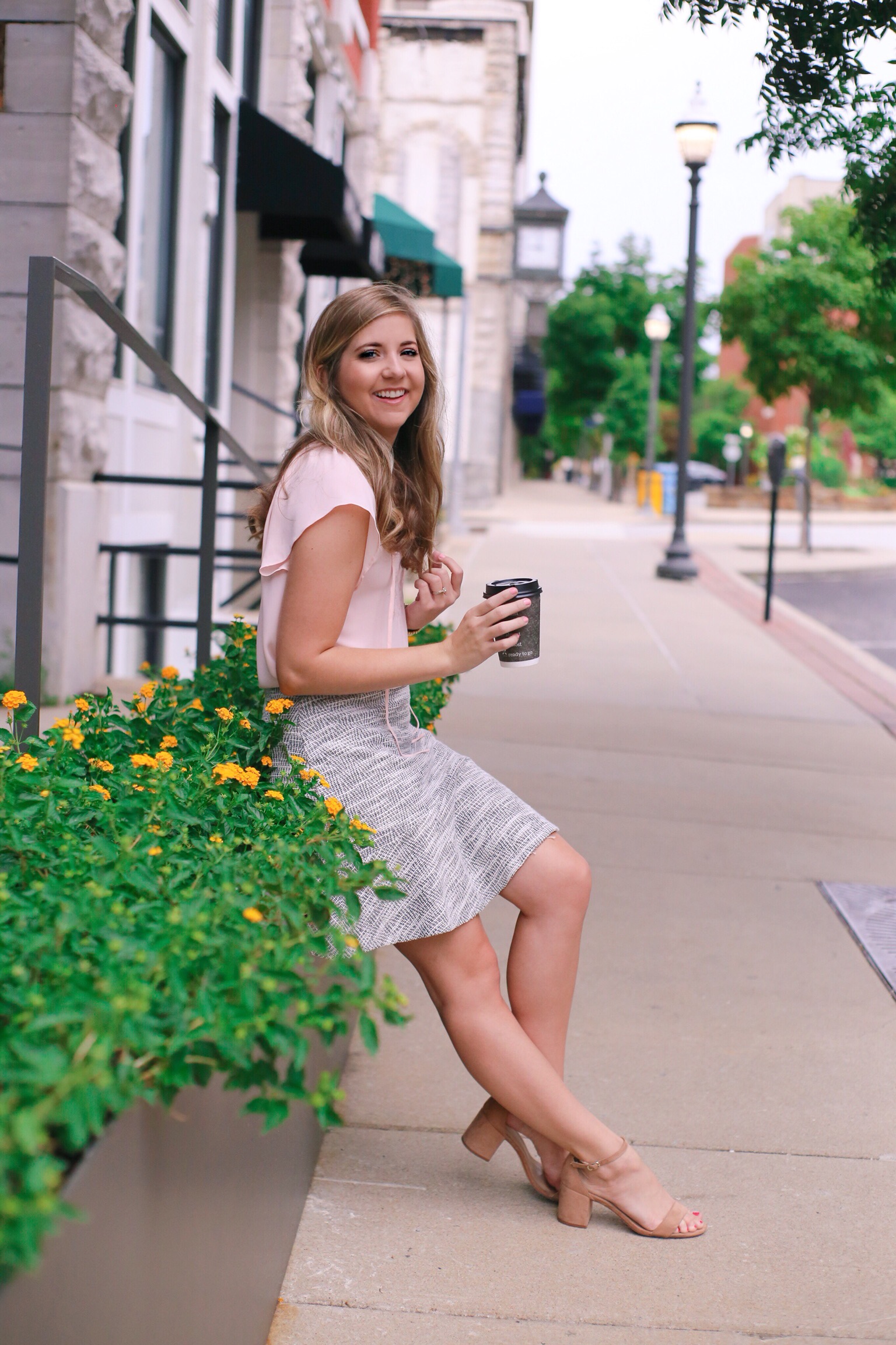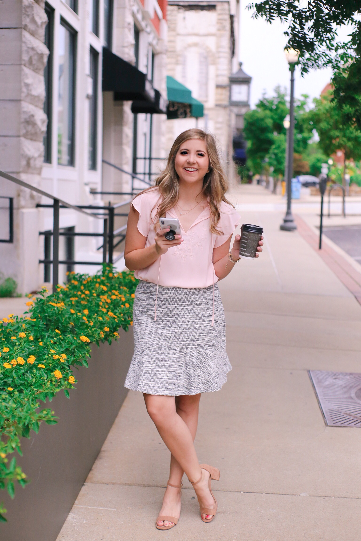 For the day outfit, I styled this pink blouse with this adorable knit skirt with a ruffle hem. I kept it simple with my favorite nude heels. No workwear outfit is complete without a phone in one hand and a coffee in the other.