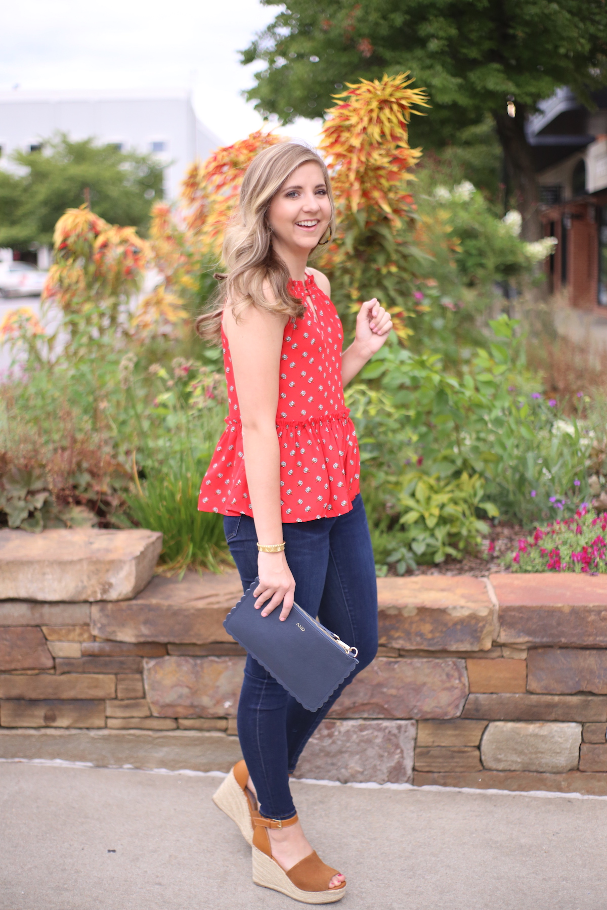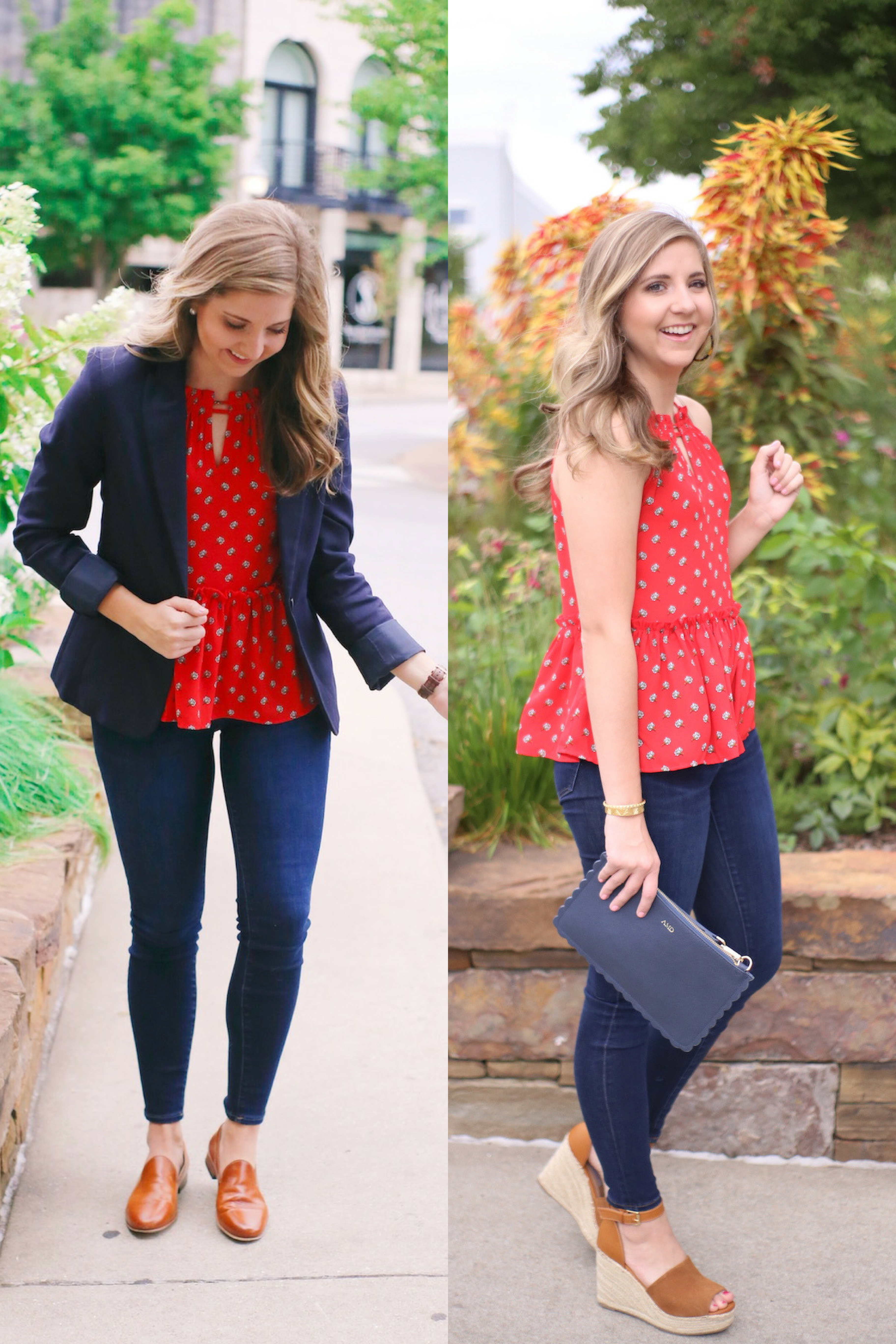 For night, I ditched the blazer and kept the same jeans. I swapped the loafers for some fun wedge espadrilles. I also switched out the minimalistic accessories for a statement clutch, hoop earrings, and flashy gold bracelets.
