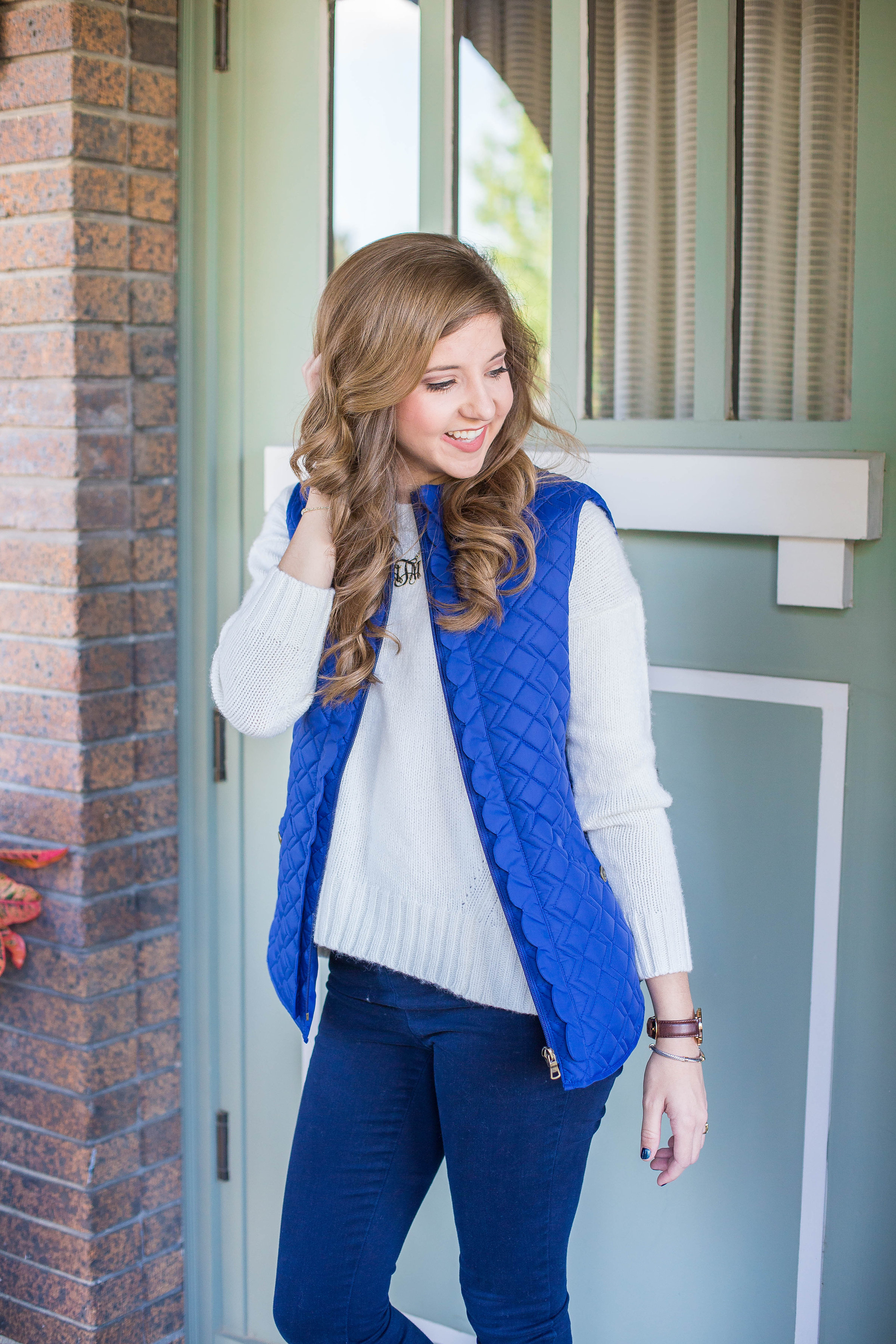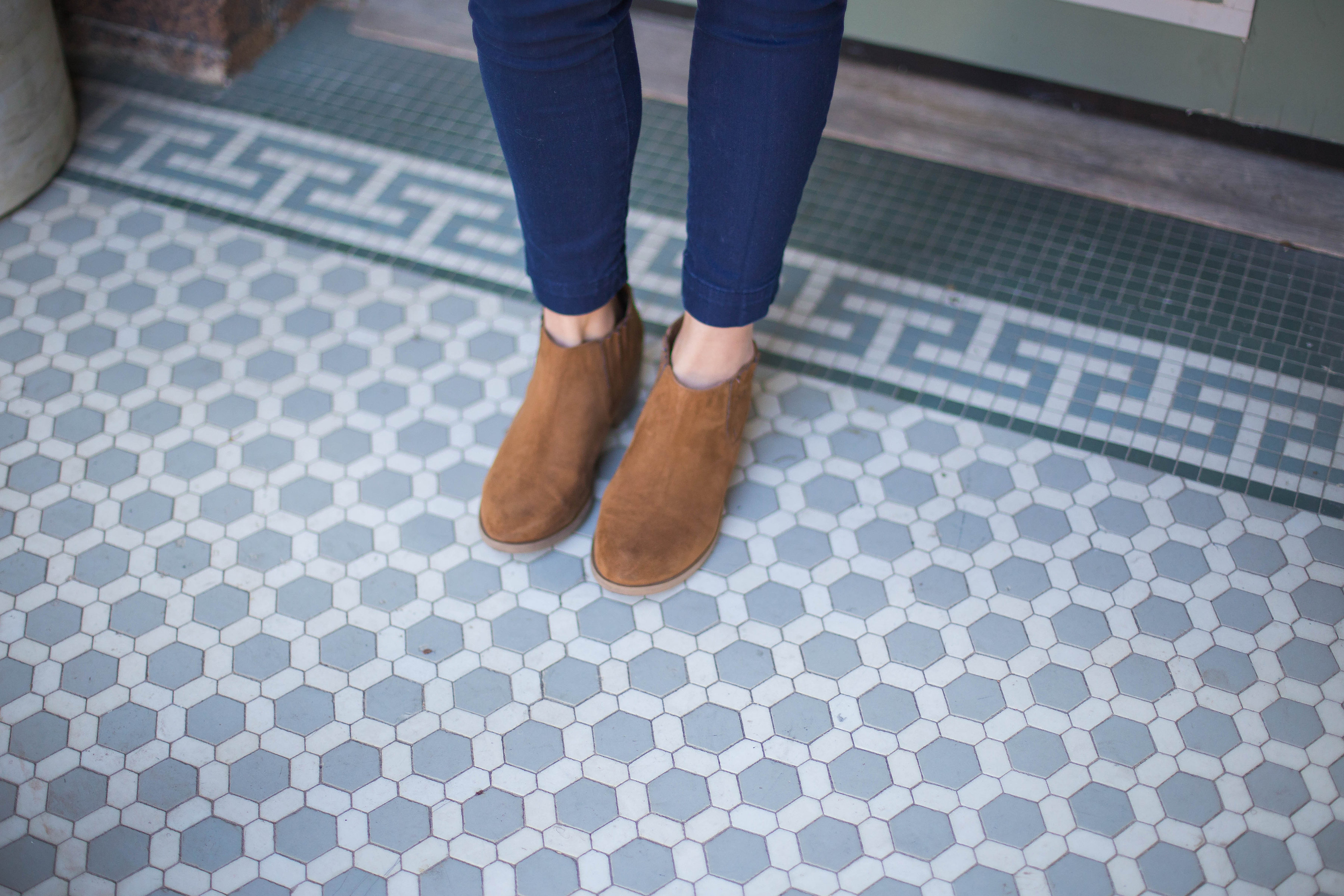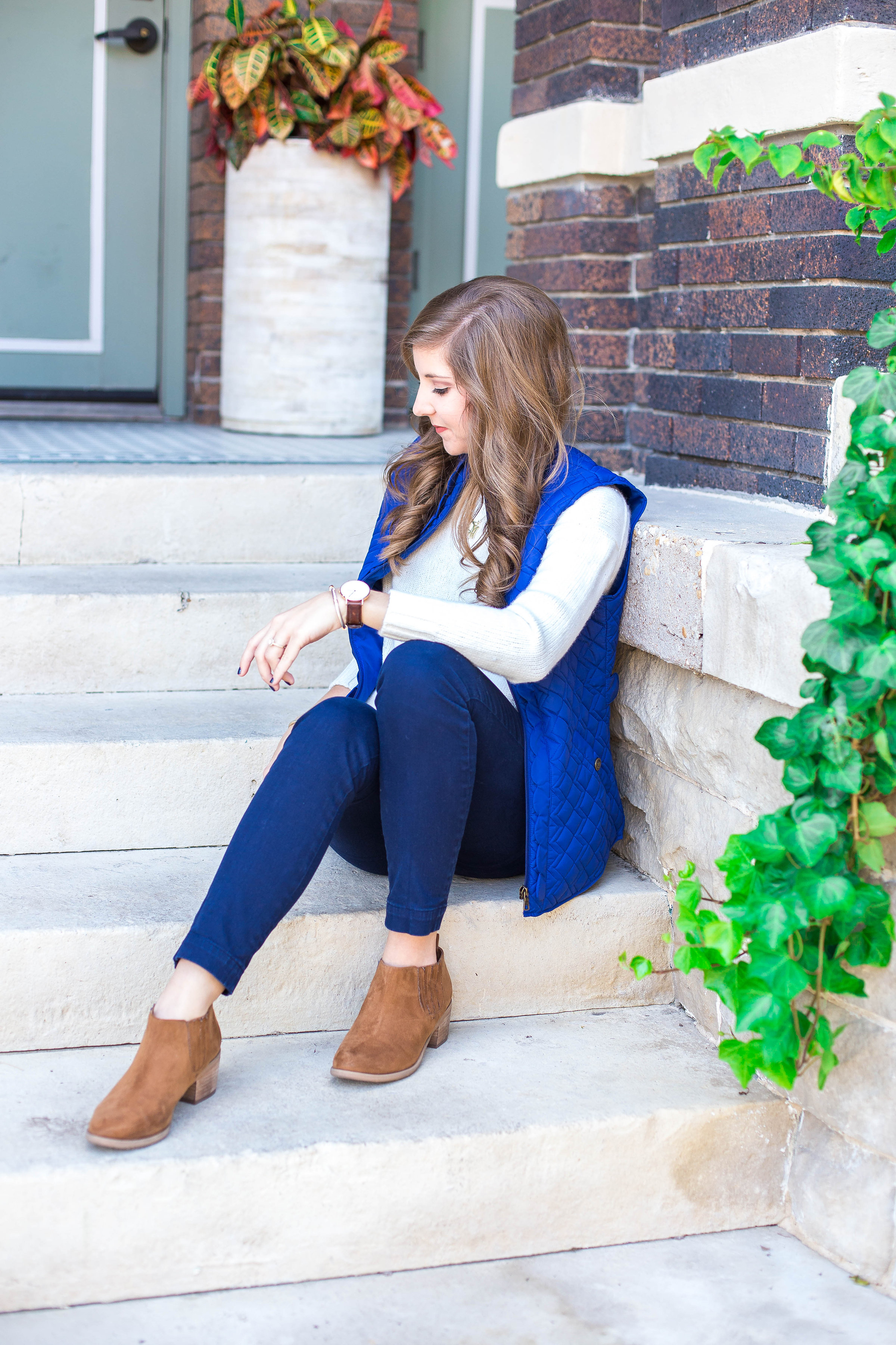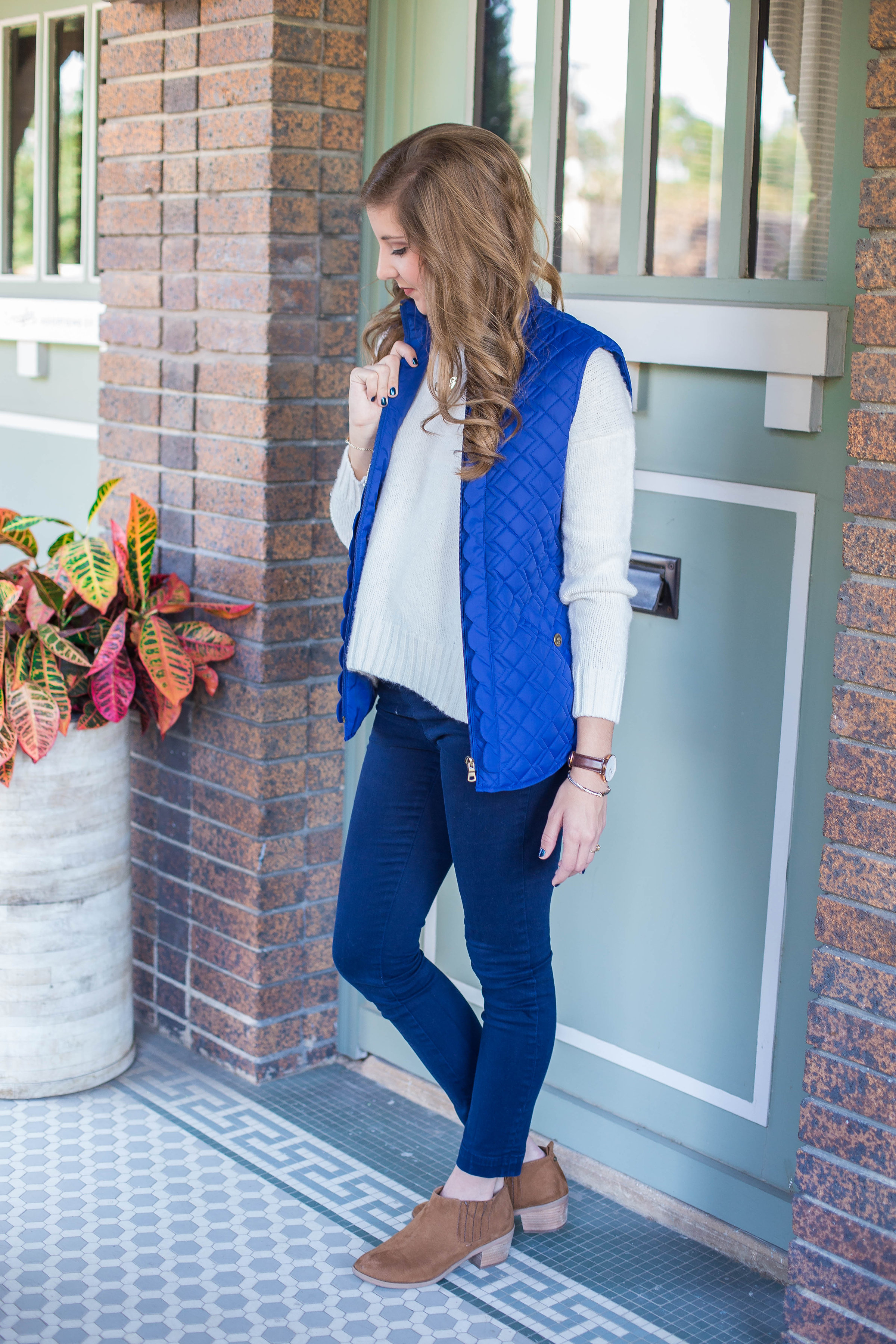 Layering a thick sweater under a vest is my go to in cold weather! If needed I will throw a button down underneath the sweater and a coat on top for extra warmth, depending on the weather…it is Texas after all so you never know.