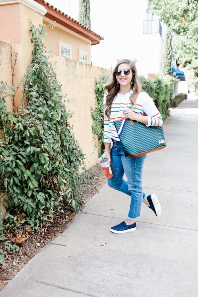 We all know those girls…those girls who switch out their purse to match every outfit. Spoiler alert…that’s not me! I wear the same purse with 99% of my outfits. My go-to this fall is my St. Anne Tote in the print dark hunter green with navy details. This color combo pretty much goes with everything and is very fall feeling.
