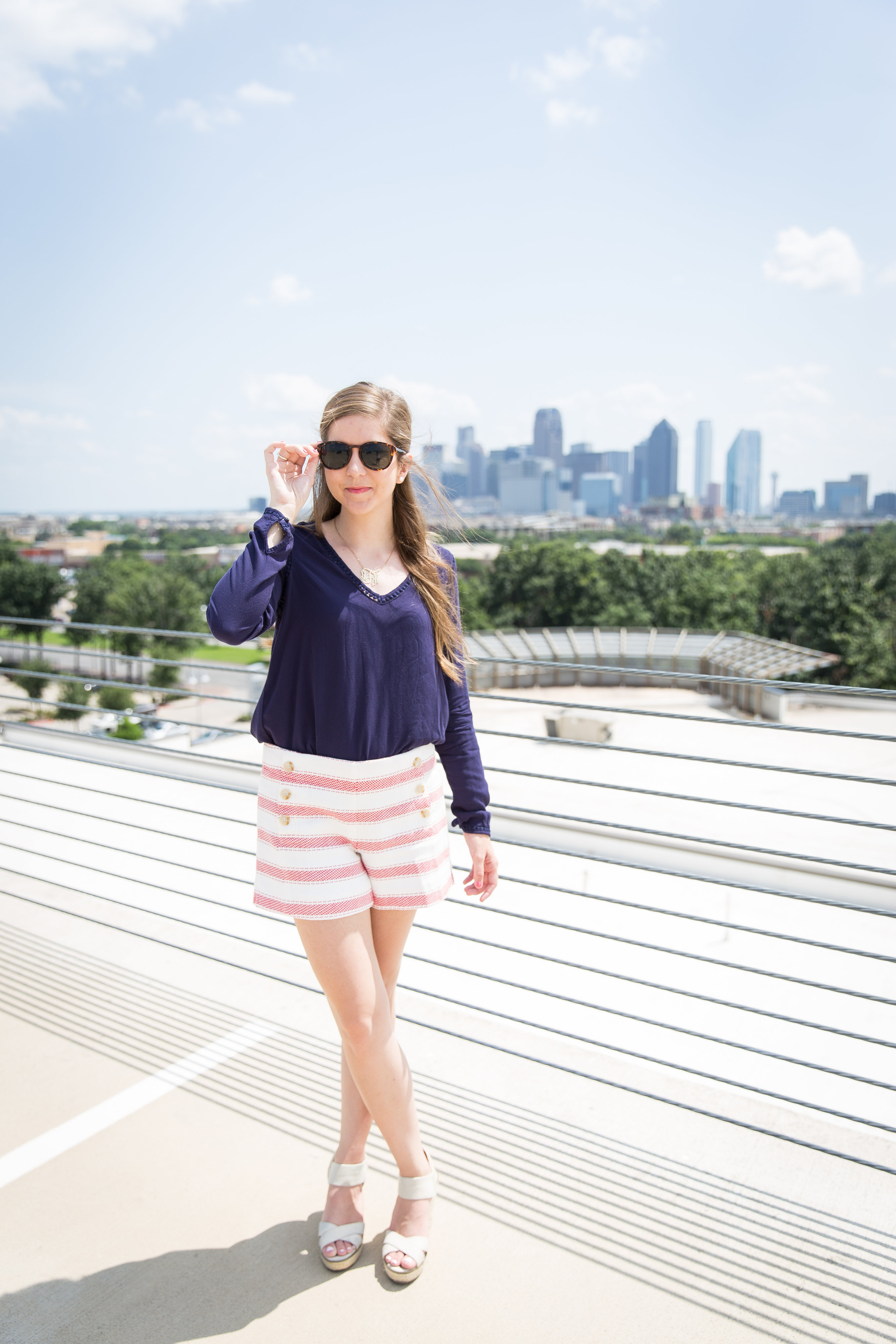 Red and White Shorts | Navy Top | Wedges | Sunglasses | Monogram Necklace | Pearls | Nail Polish