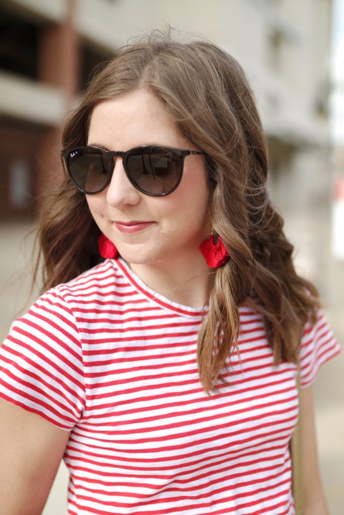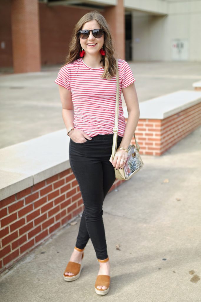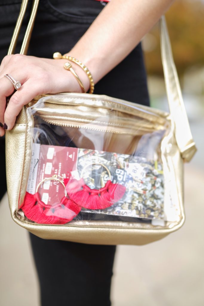 The whole look is pulled together with these gorgeous Lisi Lerch earrings. These earrings were designed with game day in mind. They are offered in several school colors and definitely make a statement.
