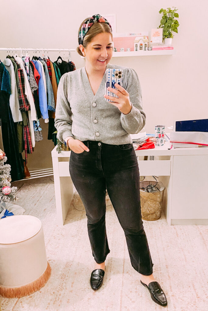 Another simple everyday look that is elevated to be holly and jolly with a simple accessory! Also don’t be afraid to mix patterns this season, especially plaid and cheetah! They go hand in hand!