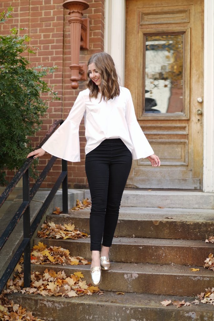 I let the earrings be the star of the show and paired with a white blouse. This top makes a big statement with it’s bell sleeves, but a similar look can also be achieved with a simple white button-down (which is almost exactly what I wore last Christmas Eve – see that look here).