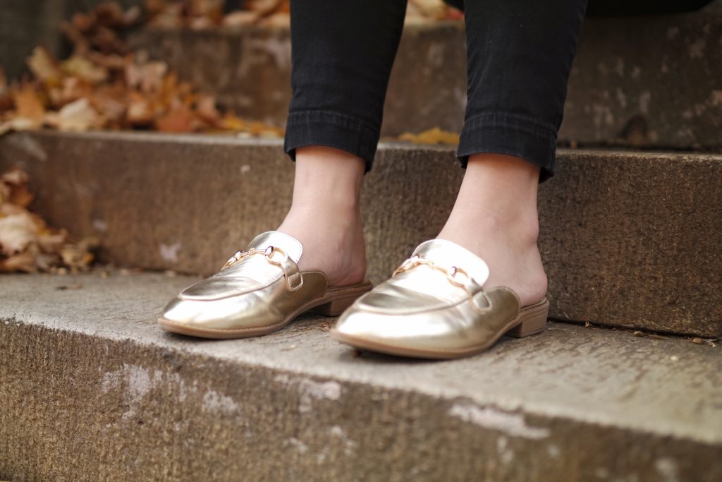 To keep with the simplistic theme, I opted for a black skinny pant with a zipper in the back. I finally topped the look off with a little glitz with some gold loafer slides. Metallics are an easy way to dress up any outfit. Just because it’s the holidays doesn’t mean you have to wear heels, these metallic slides are dressy but also comfortable!