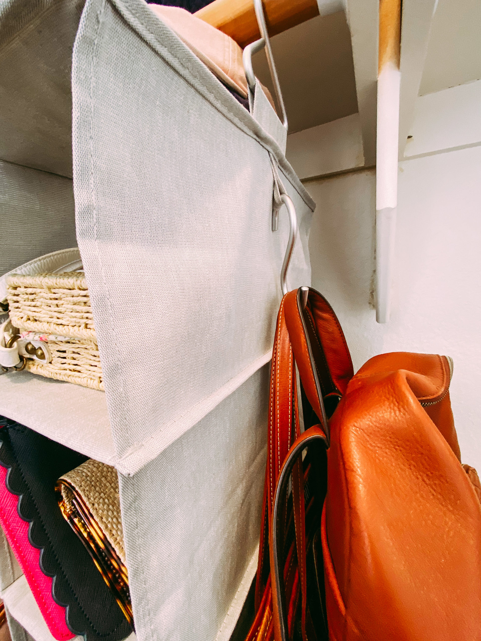 As I was doing some research on Pinterest, I noticed a small purse organizer from The Container Store for $80. For $80, I could buy a new purse lol, so I took the same concept and found a much cheaper alternative. I use a hanging shoe organizer and used each slot to put small crossbody bags and clutches in. I put the ones I reach for the most up top and seasonal clutches down at the bottom. It also came with two S-hooks which were perfect for hanging my larger floppier totes.