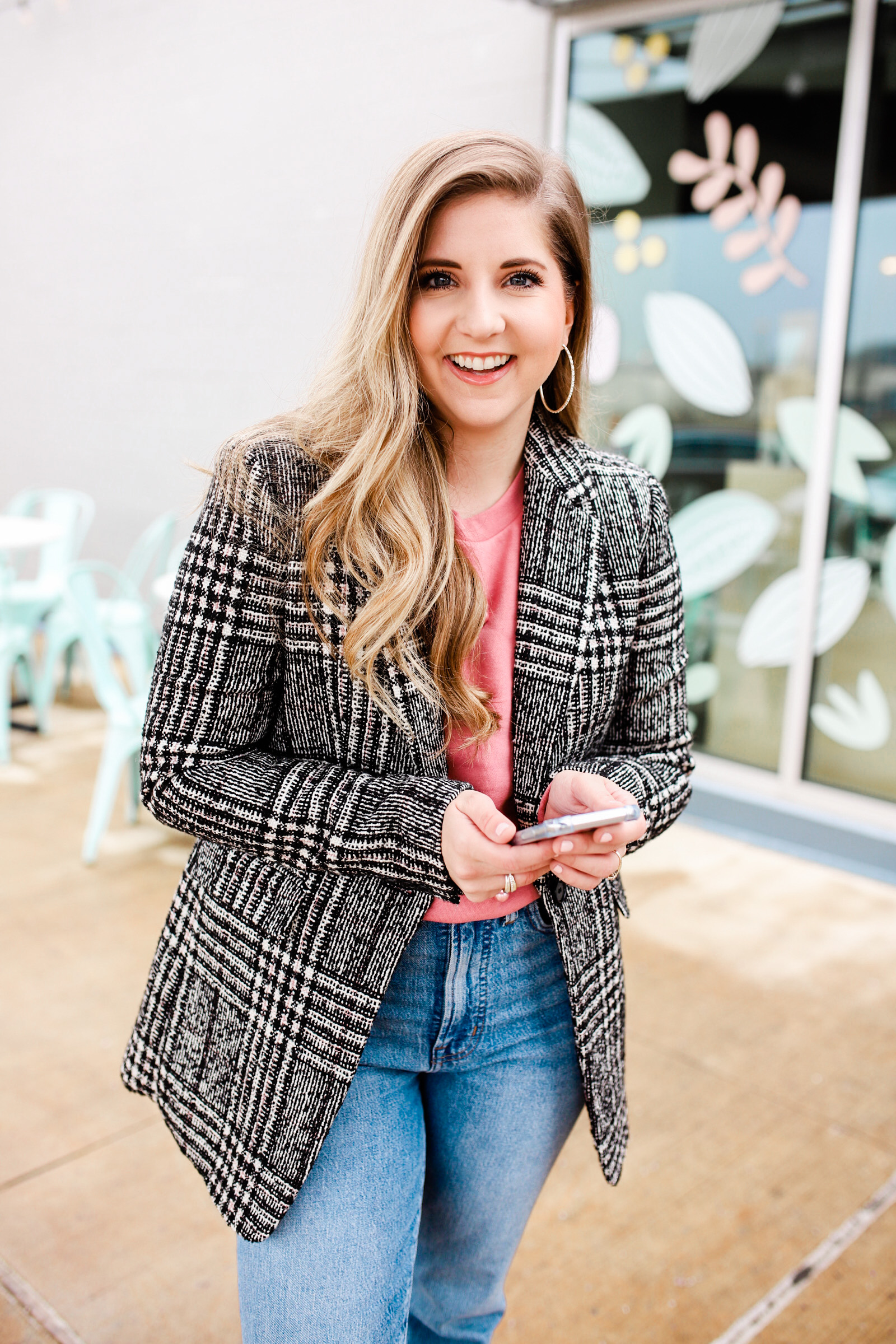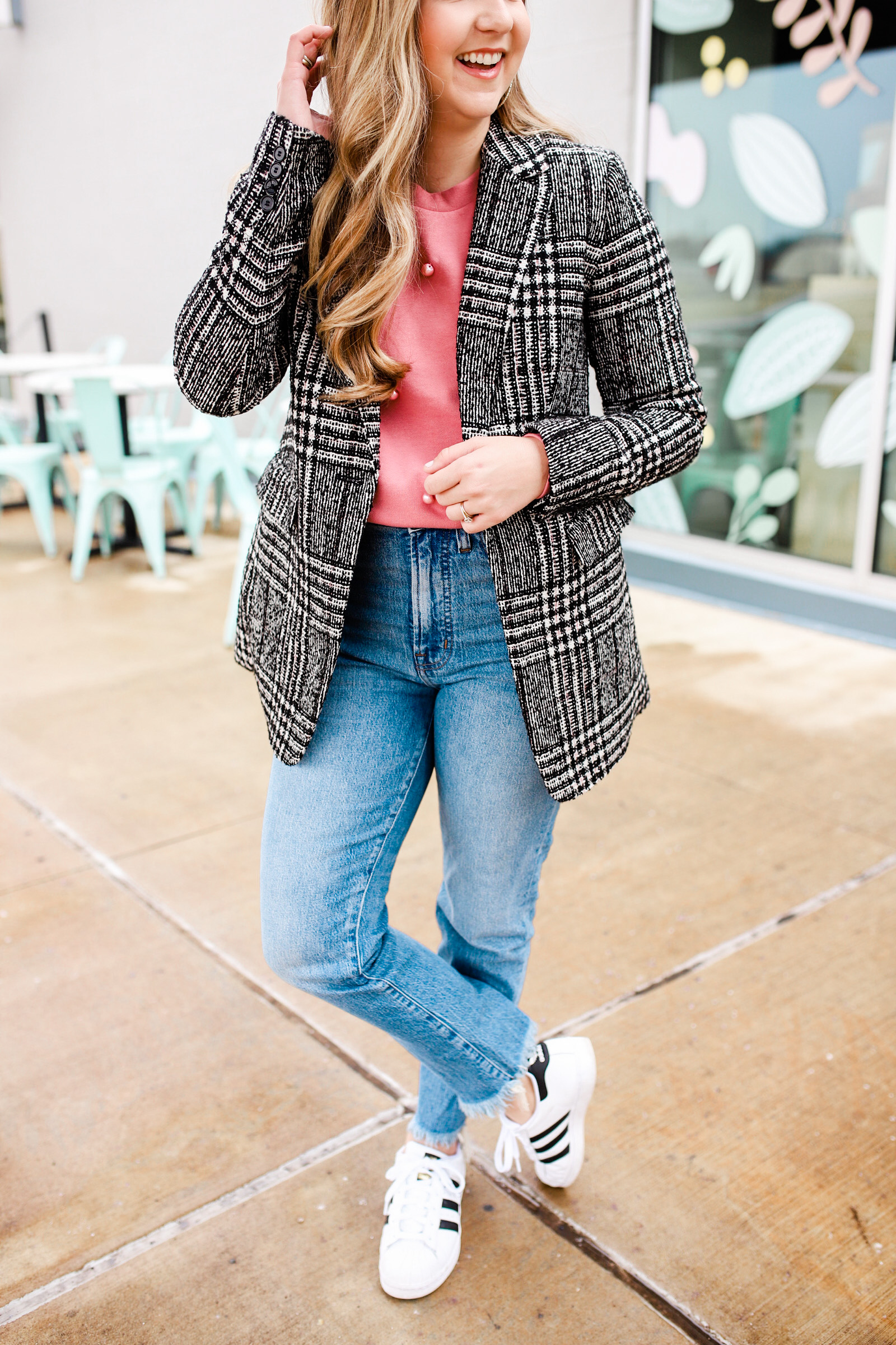 Last week, I shared this tweed longline blazer styled perfectly for work, but today I thought I would show you how to dress down a blazer for a more casual look. I really want to be better about sharing how to style pieces multiple ways, after all, I don’t wear them styled the same way every time.