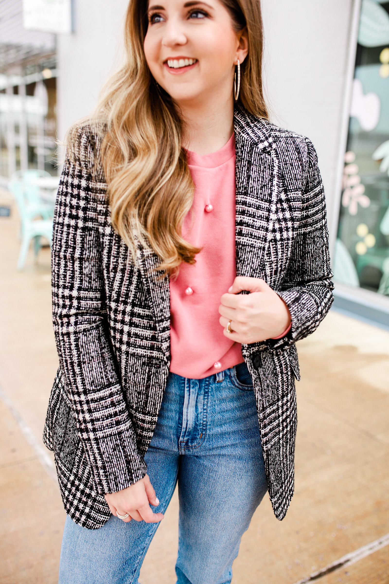 As I mentioned in last week’s blog post this blazer has the slightest hint of pink running throughout the fabric, so I really wanted to pull that out with a blush sweatshirt. I love pairing a sweatshirt under a blazer because of how the juxtaposition of the structured blazer and casual loose-fitting sweatshirt works so well together. This sweatshirt is embellished with blush-colored pearls to keep it interesting.