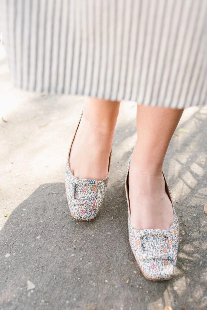 For this look, I really played into the blue color scheme and wanted to have accents to match. I recently splurged on another pair of these buckle shoes from Ann Mashburn (yes, I own 4 pairs now). I think the tiny floral pattern and the stripes compliment each other so nicely and from far away you can’t really tell.
