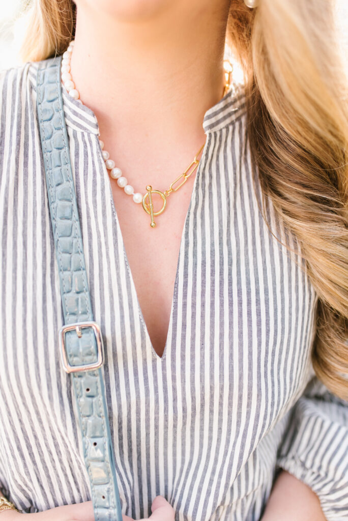 I kept the jewelry simple but because the neckline is a little lower I went with my recent favorite Amazon necklace. I also think the pearls accent the strips and floral pattern perfectly.