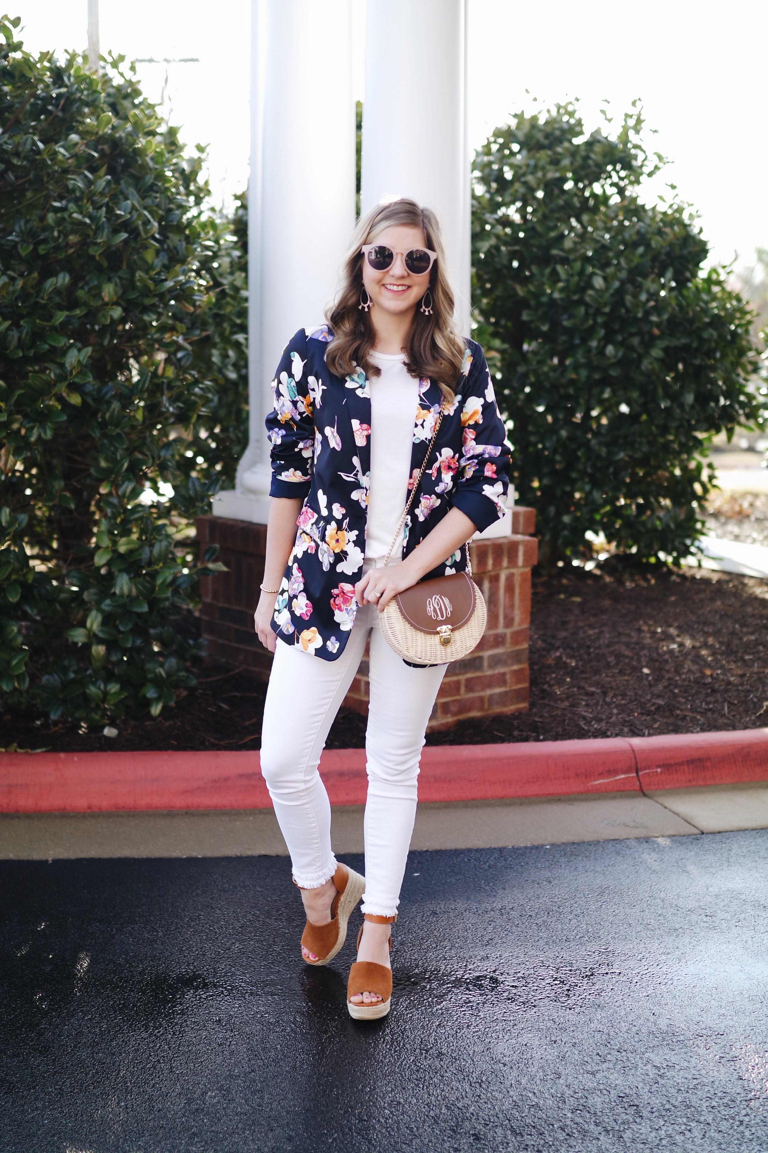 The all-white look is so simple yet so chic. Because of the contrast of the navy and white, it really allows the floral design to stand out. To add some color back in, I accessorized the look with pops of pale pink in my sunglasses and with statement earrings. To top of the whole look, I went with an ultra trendy piece for Spring, a wicker bag.
