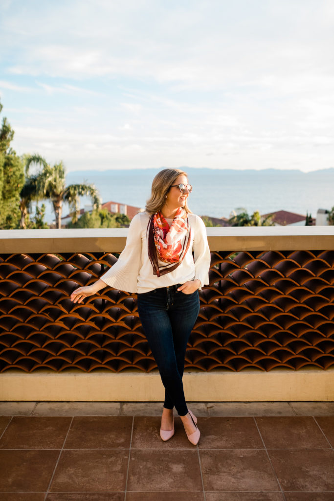 White Pleated Flare Sleeve Sweater | Floral Scarf | Dark Wash Skinny Jeans | Pink Suede Block Heels