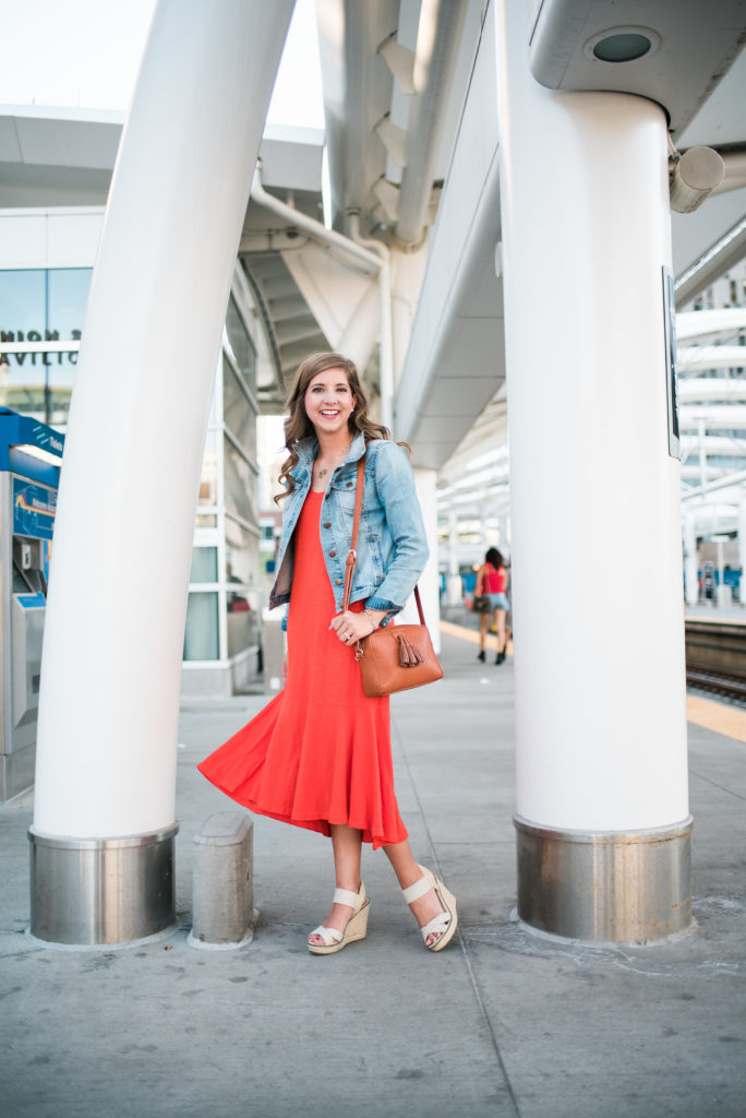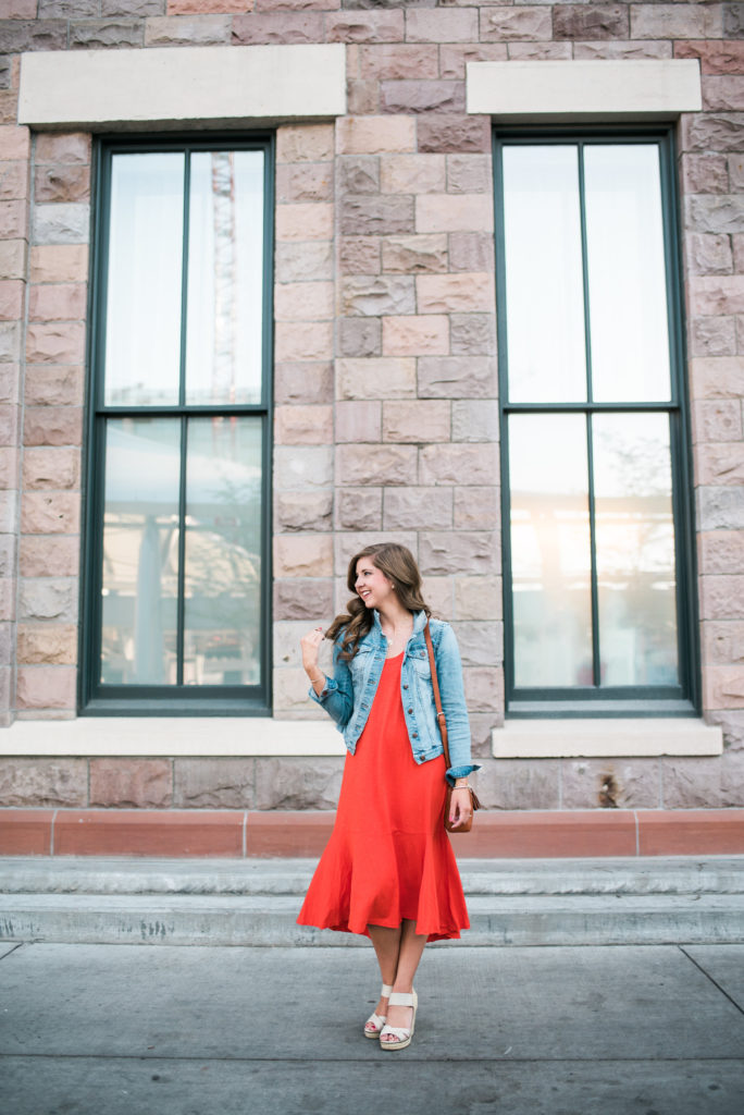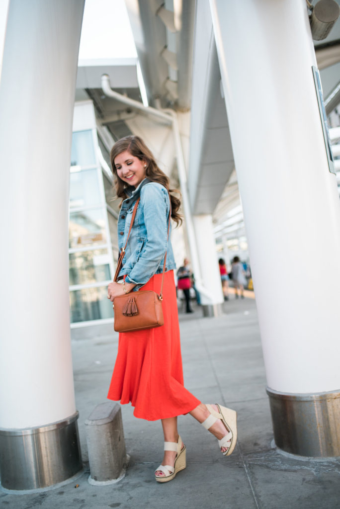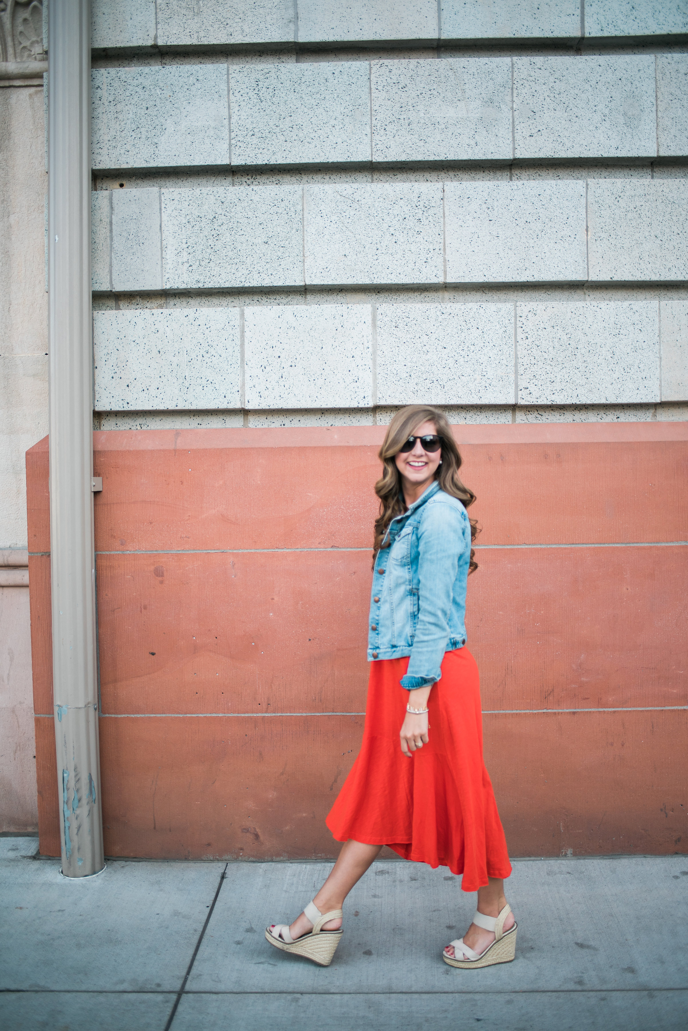 This orangey red midi dress definitely has the possibility of being too long but because it is high low and I paired it with wedges it’s the perfect length.