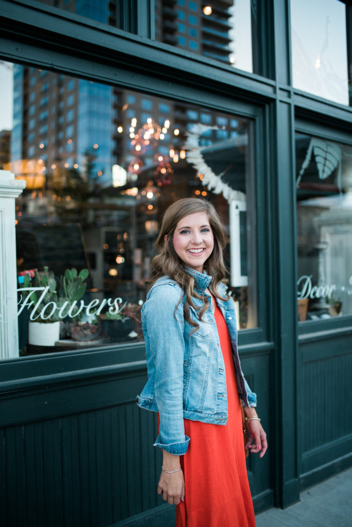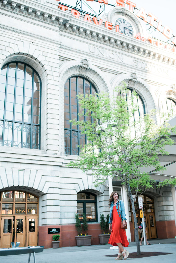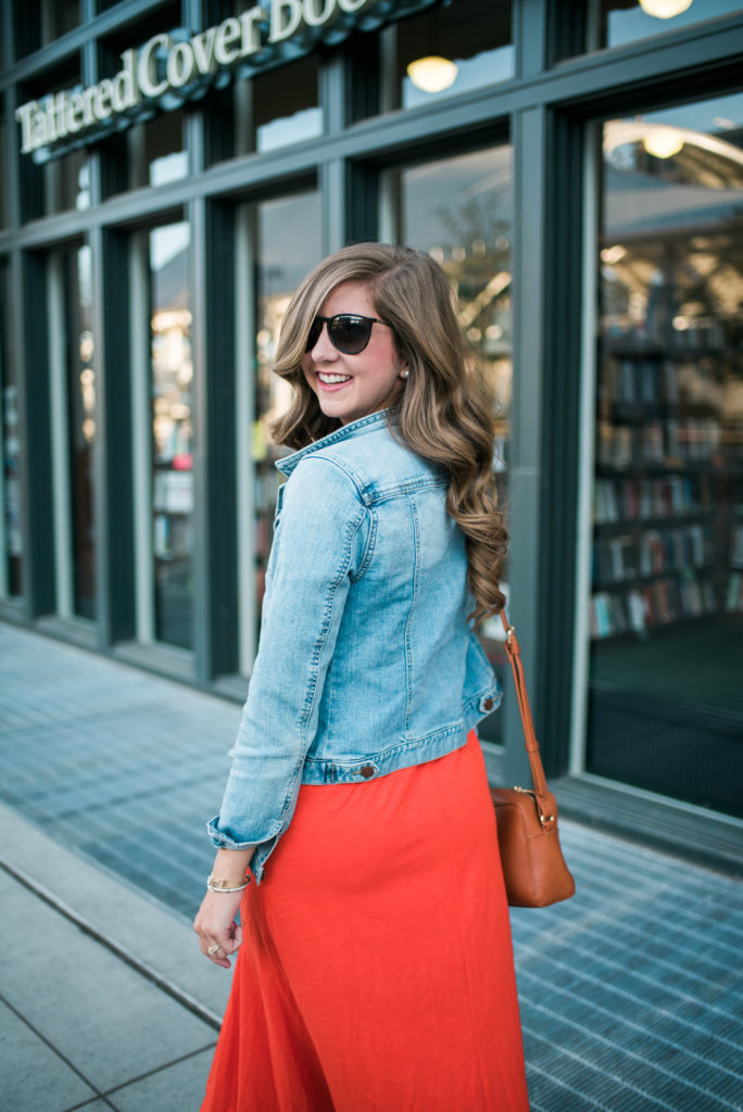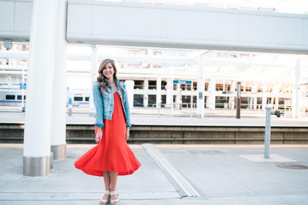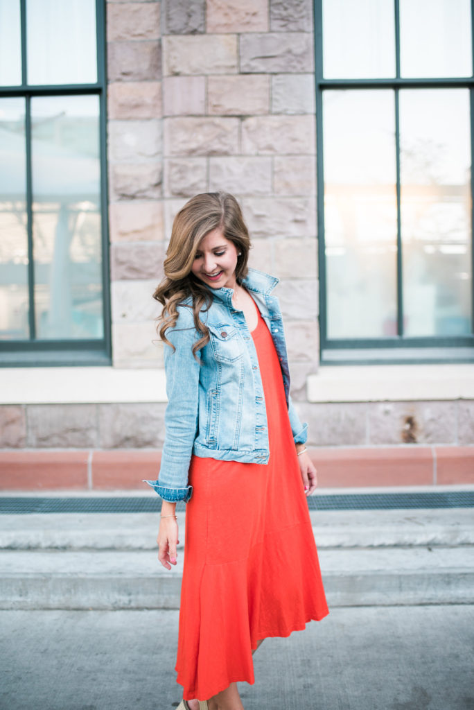 This orangey red midi dress definitely has the possibility of being too long but because it is high low and I paired it with wedges it’s the perfect length.