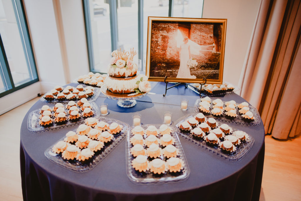 One night Jared and I were meeting with our wedding planner and she asked about the cake. I told her we just weren’t really cake people and she said that’s fine, let’s look at some non-traditional wedding cake ideas. Jokingly, Jared said we should do a Nothing Bundt Cake and we instantly loved the idea! It was so cost efficient and such a fun way to switch things up. We had a two-tiered layered cake for us to cut and then had bundtinis for all the guests in different flavors.