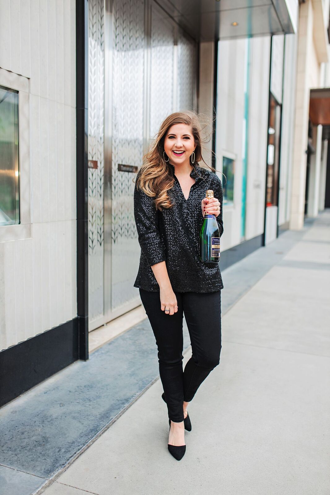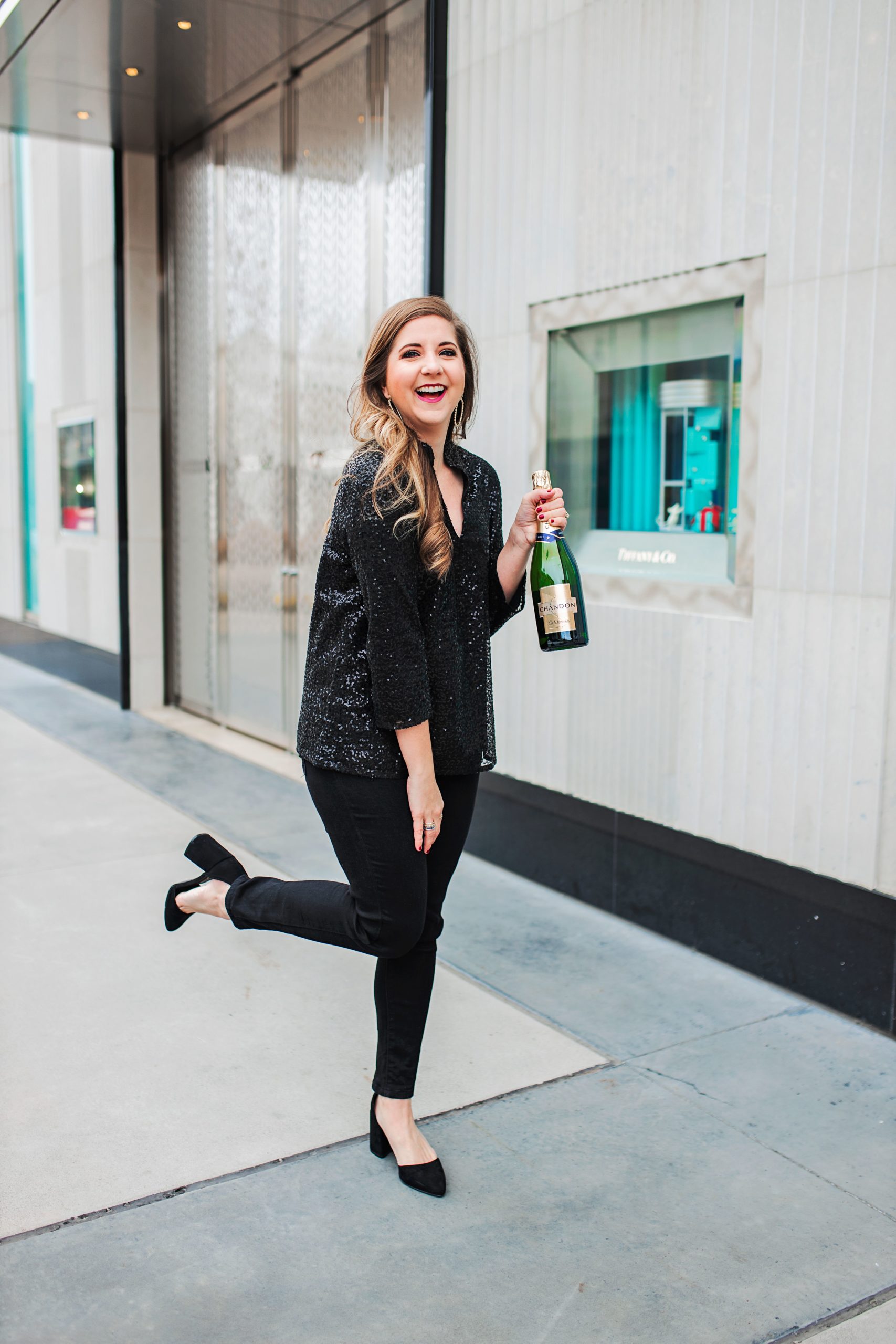I love the black sequins because it’s so different and flashy without being tacky and over the top. It pairs great with black jeans and heels for a classic all-black New Year’s look. It would also look great with a skirt, leather leggings or fun printed pants depending on how bold you want to be. It is a tunic so it covers the booty so if you want to rock leggings, you can do it with ease!