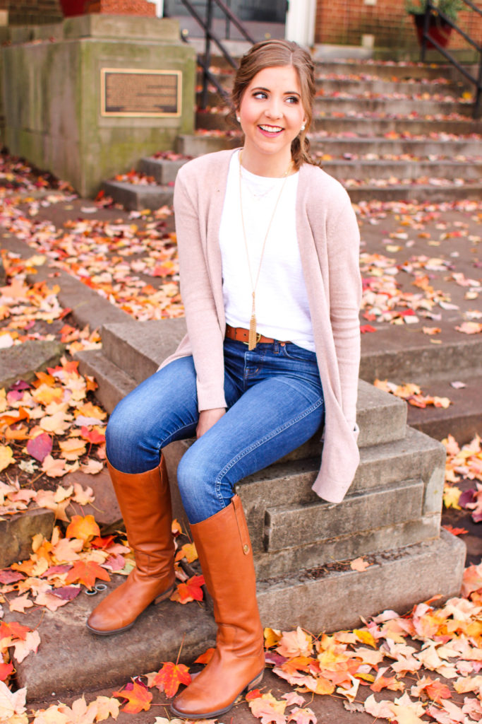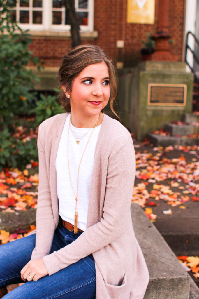 To stray away from the teacher vibes, I chose to style this blush/taupe cardigan with a white tee and jeans. (I’m not much of a leggings girl.) I also went with a front tuck and layered jewelry and because I am in love with my new updo I topped it off with a funky hairstyle.