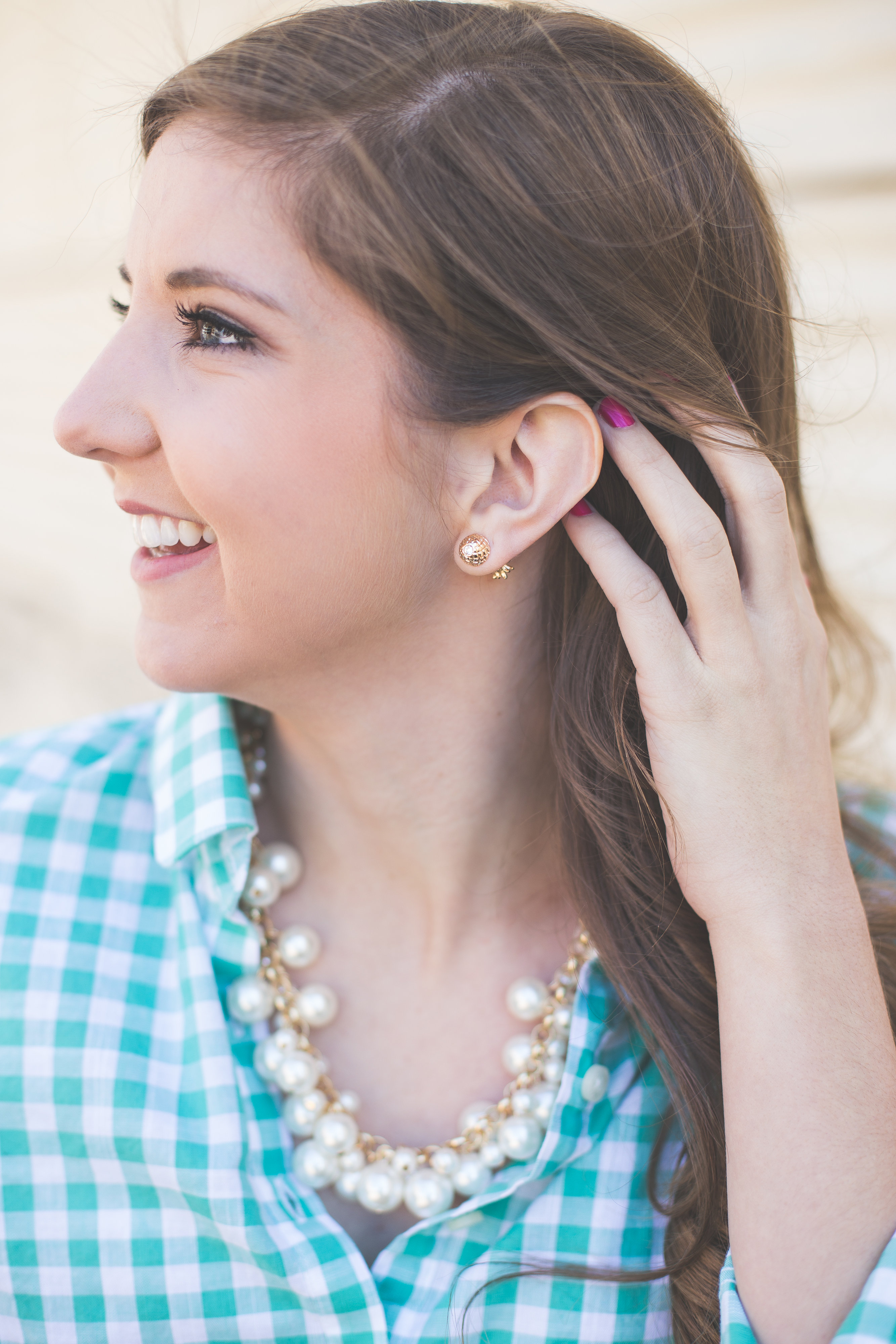 I typically wear my pearl earrings except for when I am wearing a pearl necklace…duh that’s a lot of pearls. I accented this necklace with a pair of “secret” pineapple earrings. I say “secret” because from the font they look like regular gold studs but from the back they are pineapples! It’s like a little secret only you know about if your hair is down or you can wear your hair up to show off these fun earrings.