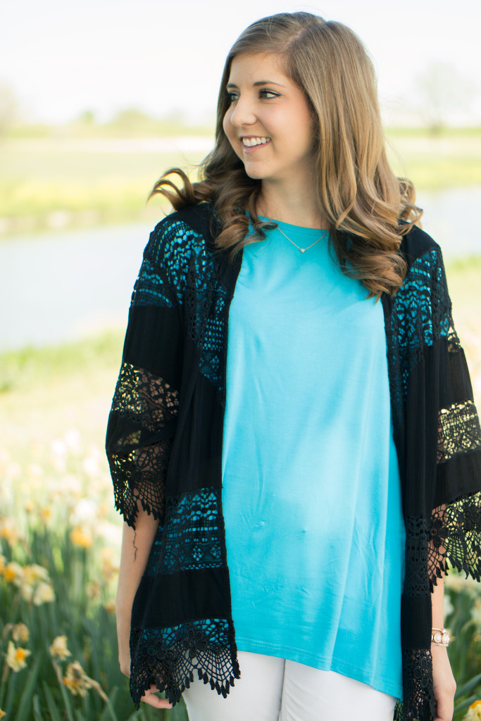 I love Piko tops because you throw them on with shorts and a statement necklace or boyfriend jeans and kimono, like I did below, and you are good to go. You can not go wrong with the variety of colors and, of course, the price!