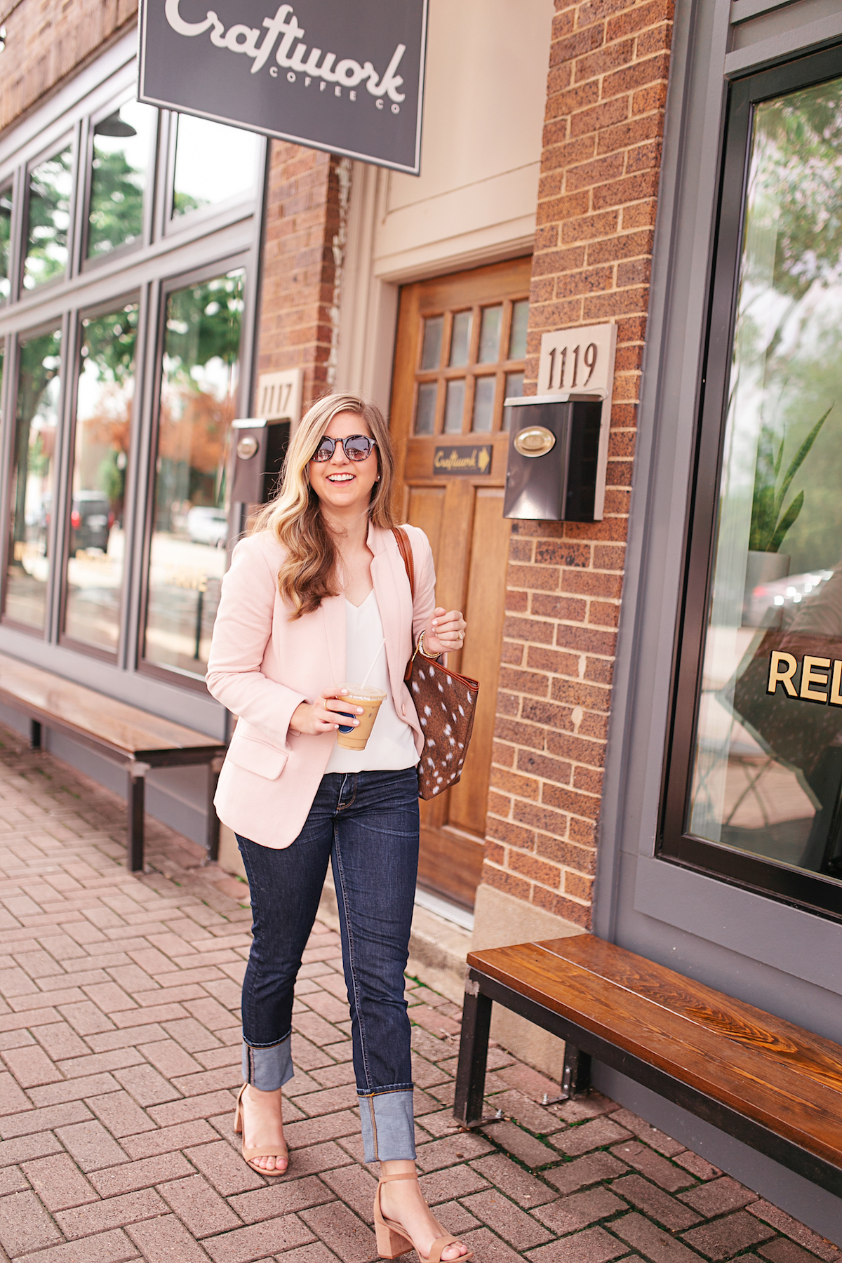 When I style my outfits I typically choose one main focus item and then find other pieces that work complimentary to it. In this instance, the focus of the outfit was the pink blazer. I love to pair a basic v-neck tank under blazers to give it a breezy feel. Sometimes with blazers, it’s easy to feel button up and polished, but by showing the décolletage it makes the outfit feel more relaxed and with this particular blazer it allows the unique collar to stand out.