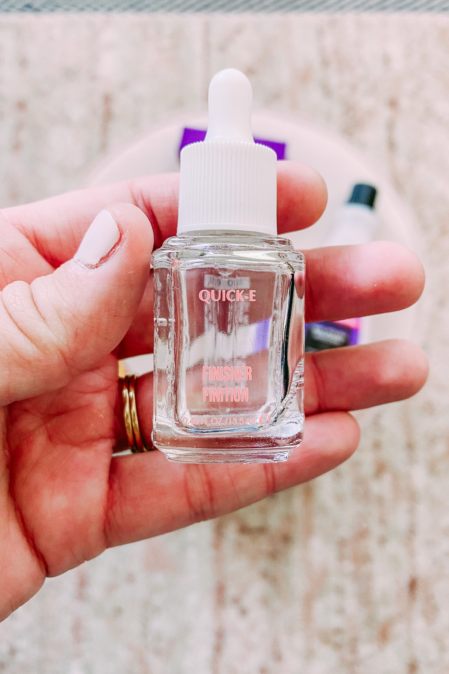 The next few steps are pretty straightforward. One coat of base coat. Two coats of color. One top coat. After the topcoat comes in my secret weapon…drying drops. Drying drops are an oil-like substance that lets your nails drying in double triple the time. I can paint my nails and 15 minutes later go to bed with no sheet marks or jump in the shower and be completely fine!