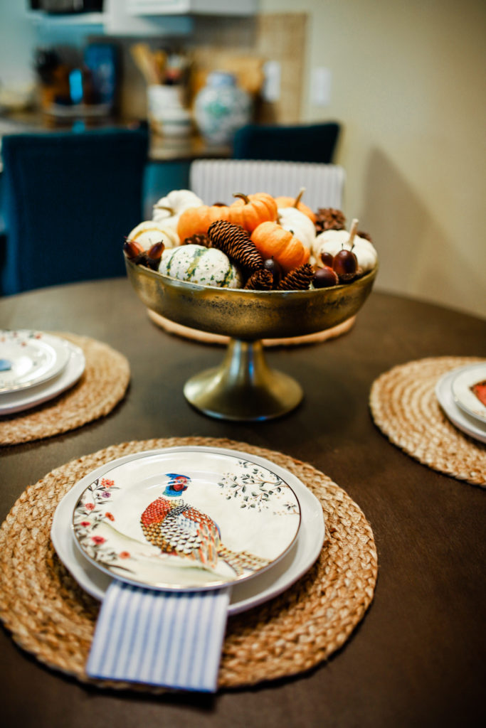 For our dining room, I really wanted to swap out my place settings for something fall but was trying to be cost-effective. I found these fall bird salad plates at Pottery Barn on major sale and layered with our white Vierti dinner plates. We always have this gold decorative bowl on our table and just switch out the content seasonally. I picked up these small pumpkins from Walmart and faux pinecones and acorns from Hobby Lobby and voila easy peasy centerpiece.