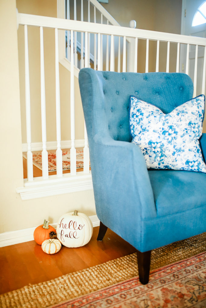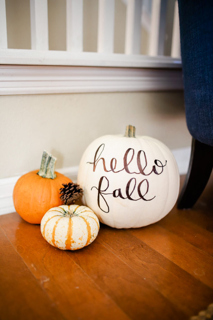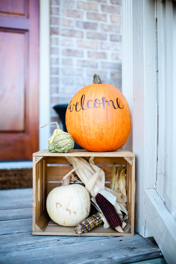 I mentioned in the 10 things I am currently loving blog that I have been working through the Happy Hand Lettering book and in the book Maghon has a hand lettering pumpkins project and I loved the idea so I tried my hand at it for our outside and inside pumpkins. I decided to write welcome on the exterior pumpkin and hello fall on the interior. I absolutely love how they turned out and they add that extra detail that was essentially free.