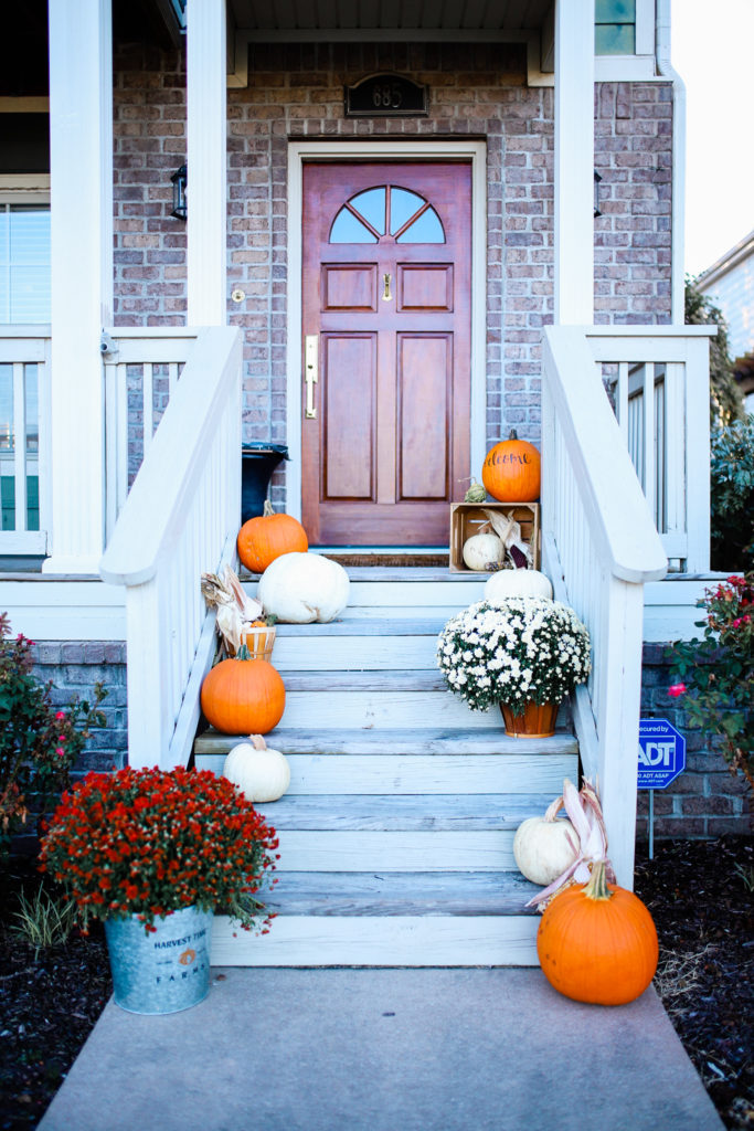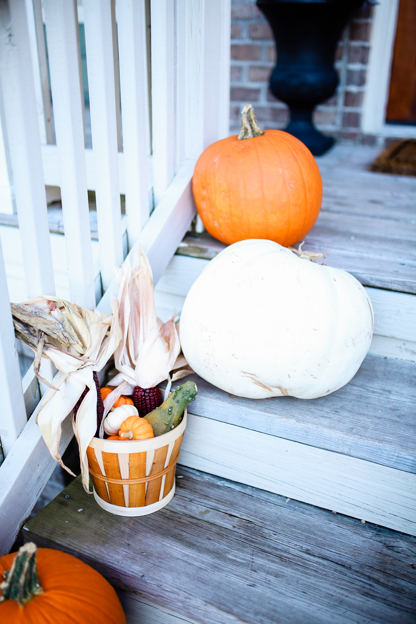 For our fall home decor, I tried to keep it minimal by really focusing my attention on the front porch steps and sprinkling pumpkins within the inside of our home and a centerpiece on our back patio table. To stick to a budget I got all of our large orange pumpkins, small white and orange pumpkins and gourds at Walmart. It’s not as glamorous as going to a pumpkin patch but they are significantly cheaper. All of the white pumpkins, mums, corn, and small orange pumpkins came from our local garden center.