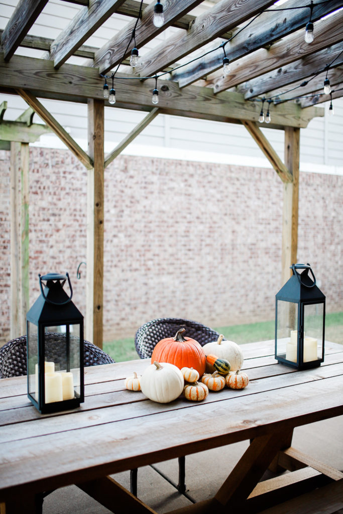 Lastly, our back patio needed some fall love so I just gathered the leftover pumpkins and clumped them together for a centerpiece. We always have these lanterns on our patio table but they feel extra fall with the pumpkins in between them.
