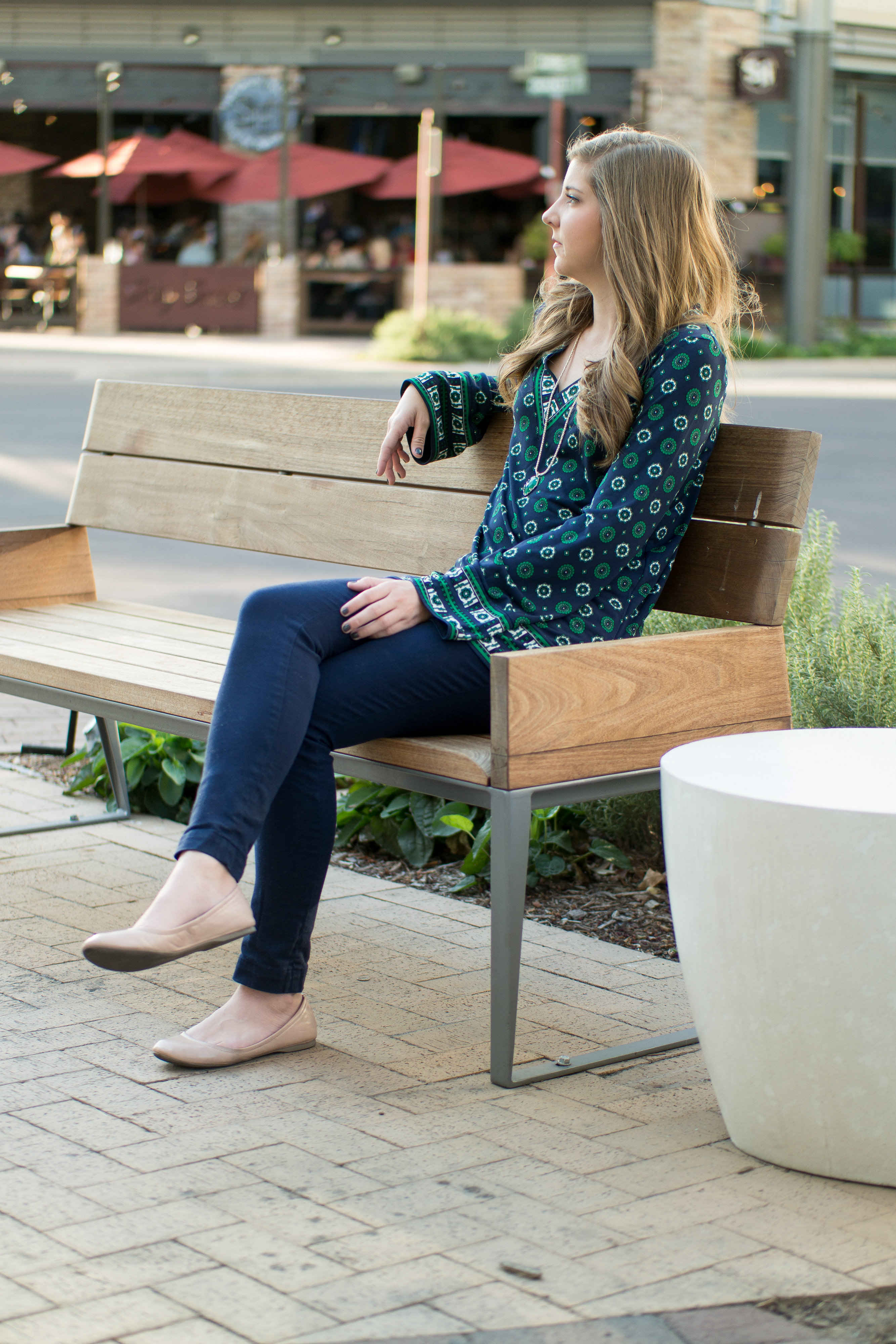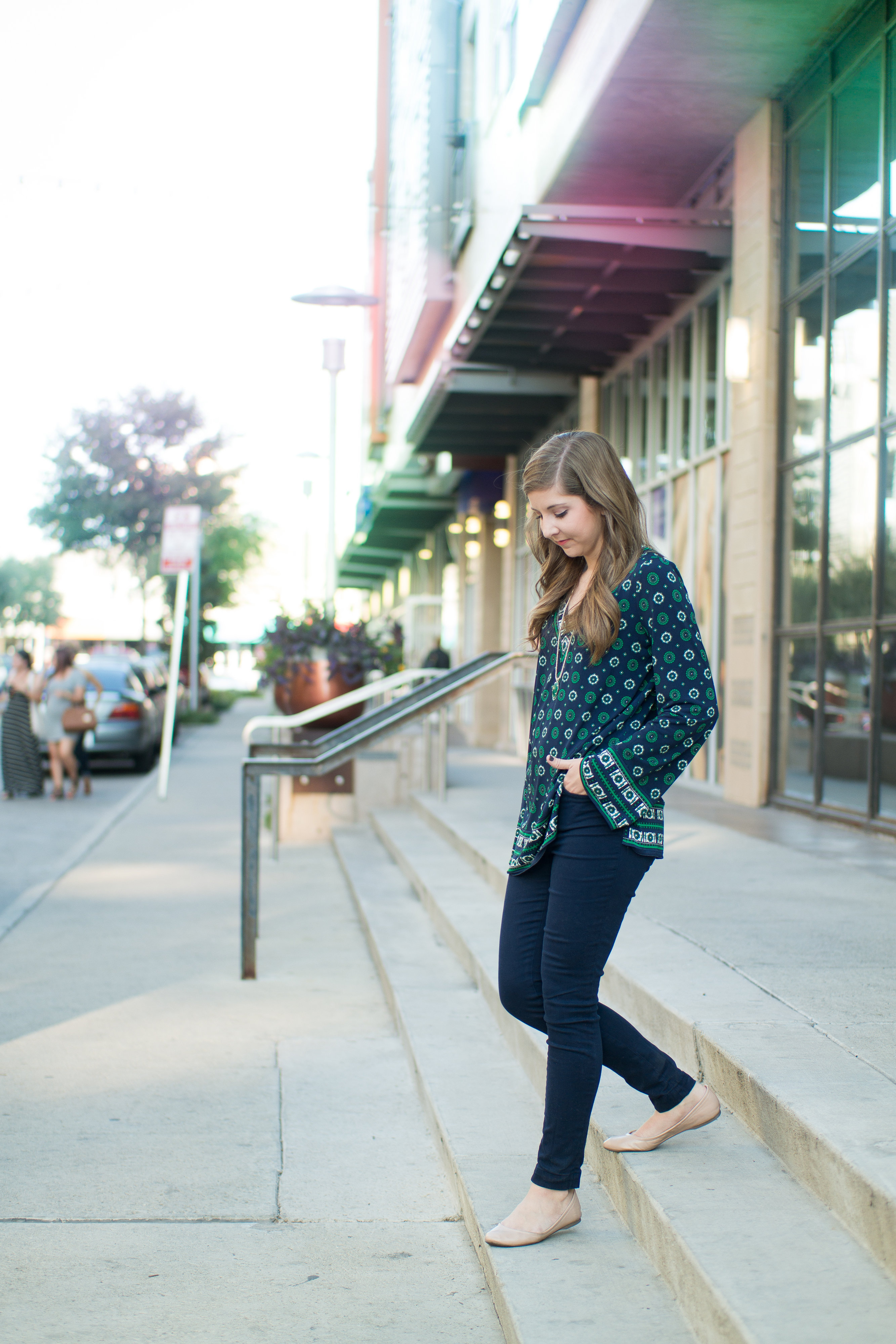 This Michael Kors printed top is 70’s inspired but super easy to style because of the bold print and interesting shape. Keeping it simple with nude flats, navy skinnies and minimal jewelry was a no brainer.