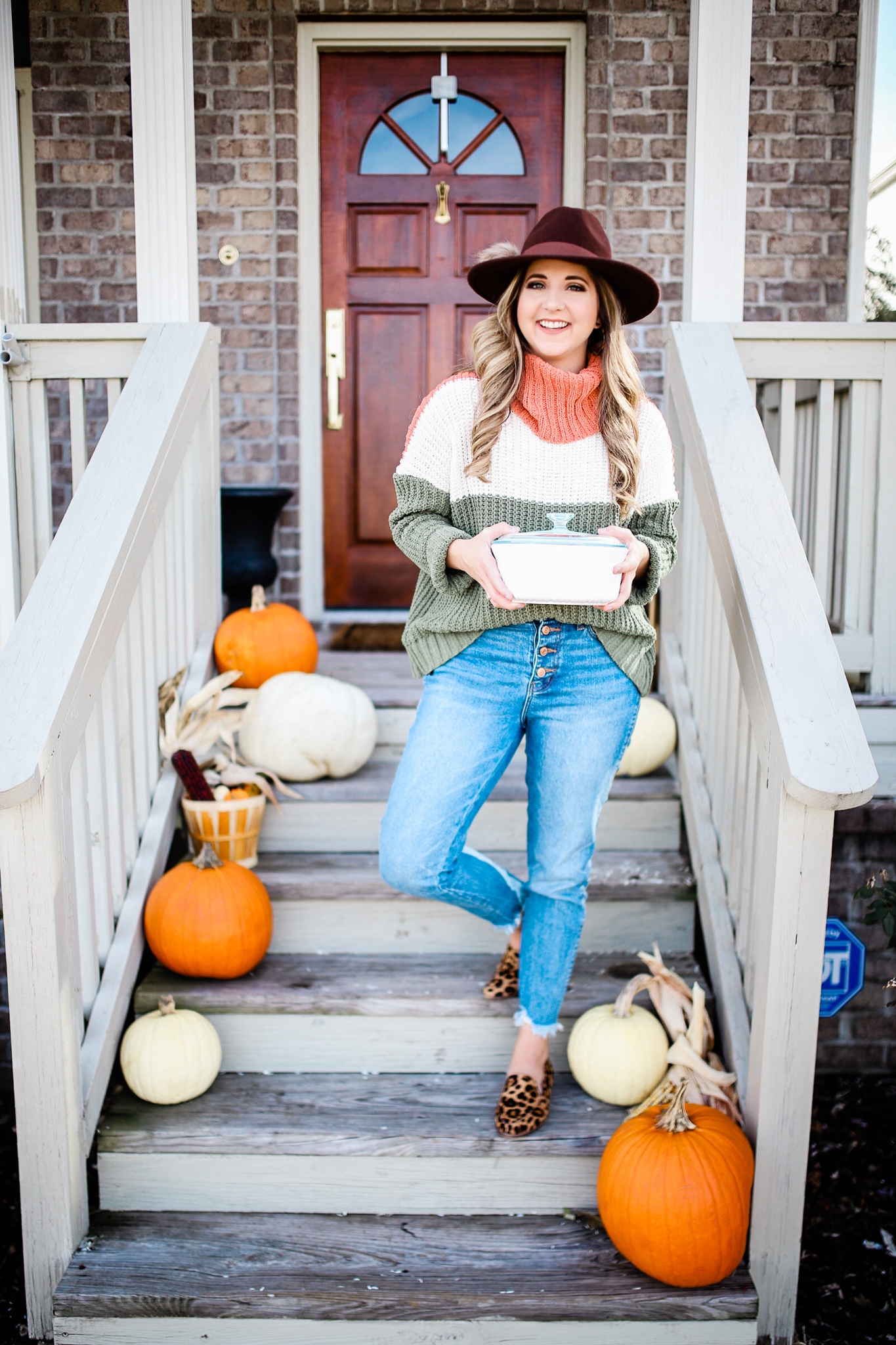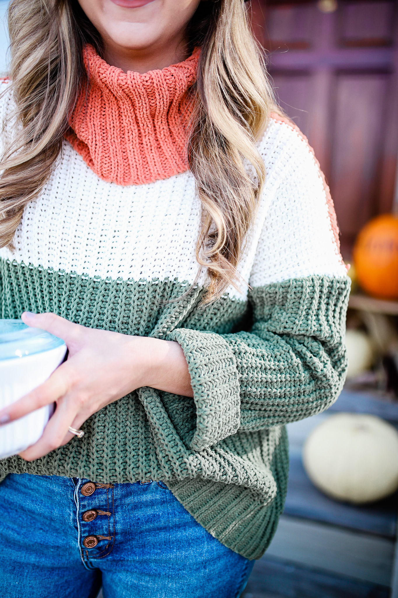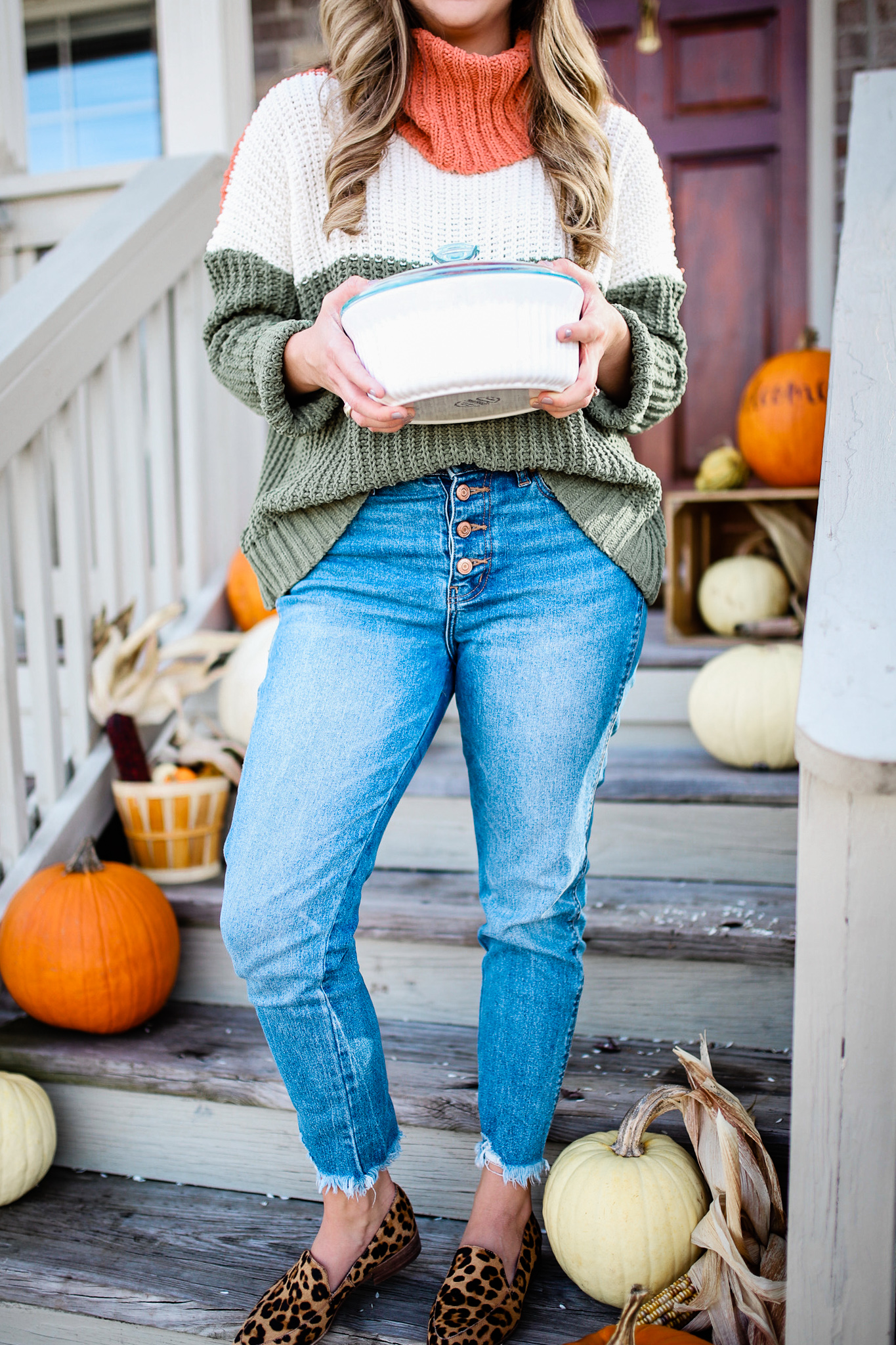Comfort is key on Thanksgiving and this chenille color block sweater and button front jeans are just about the comfiest thing I own. I love the colors in this sweater because it screams fall. These jeans a looser fitting style so they are very comfortable but still look stylish with the button front detailing.
