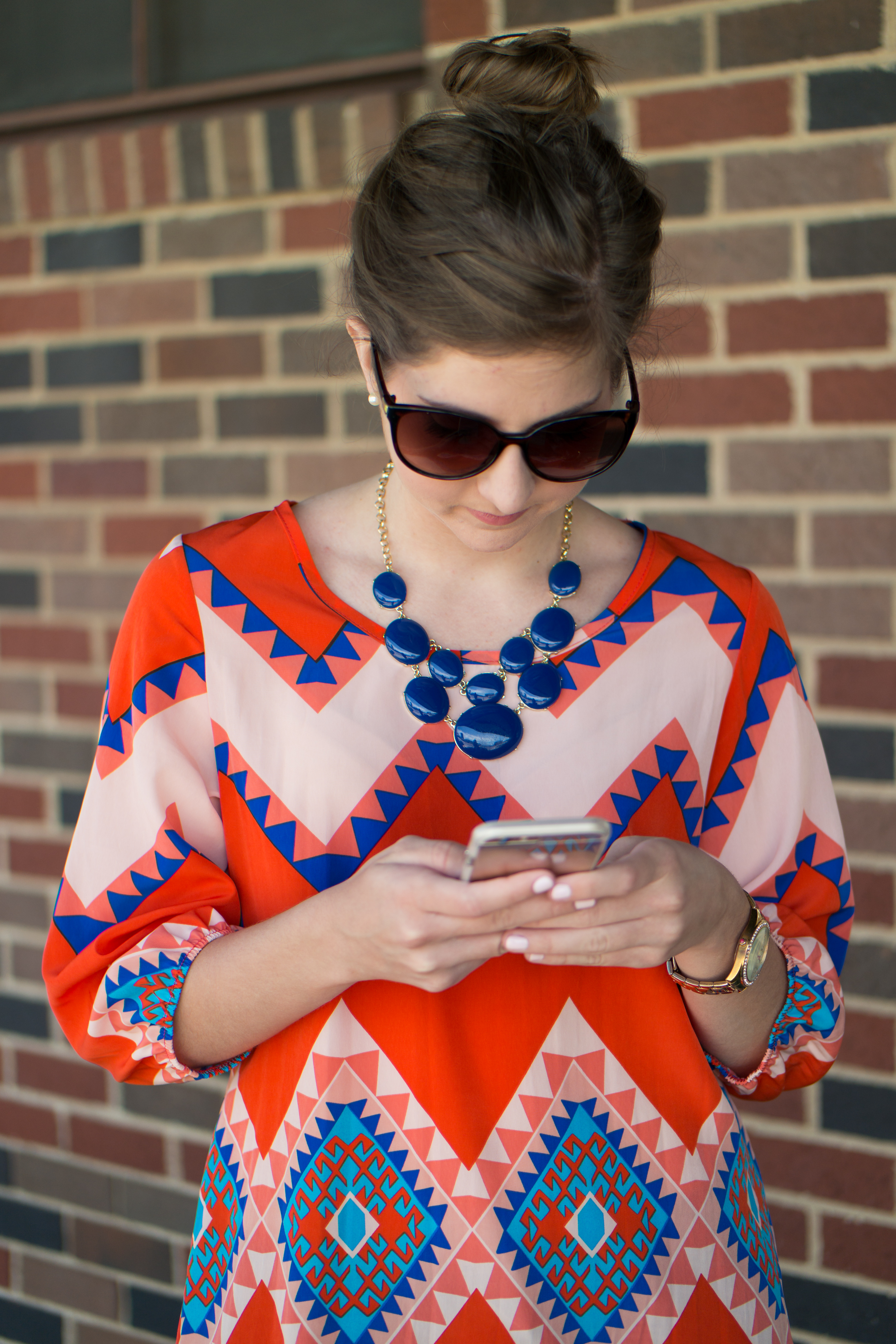 This vibrantly colored tribal blouse is on trend but still blends in to my wardrobe. I paired with a statement necklace and pearl earrings which are a staple for me and voila!