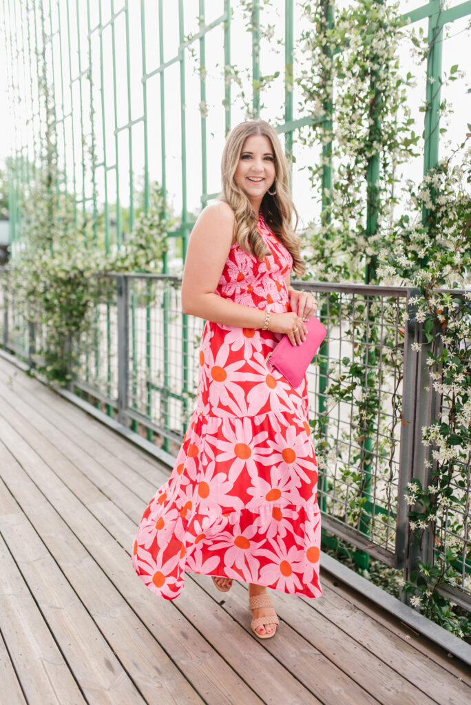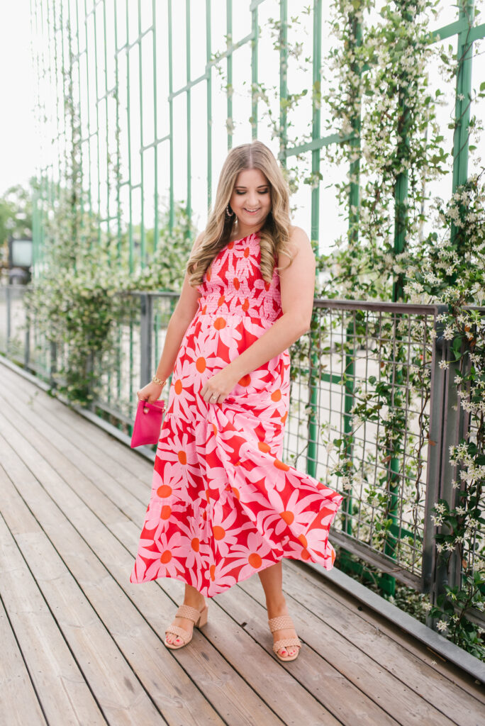 I’m wearing a size medium and I’m 5’2″ for reference. This dress is also perfect if you have a larger bust because the smocked chest is very forgiving.