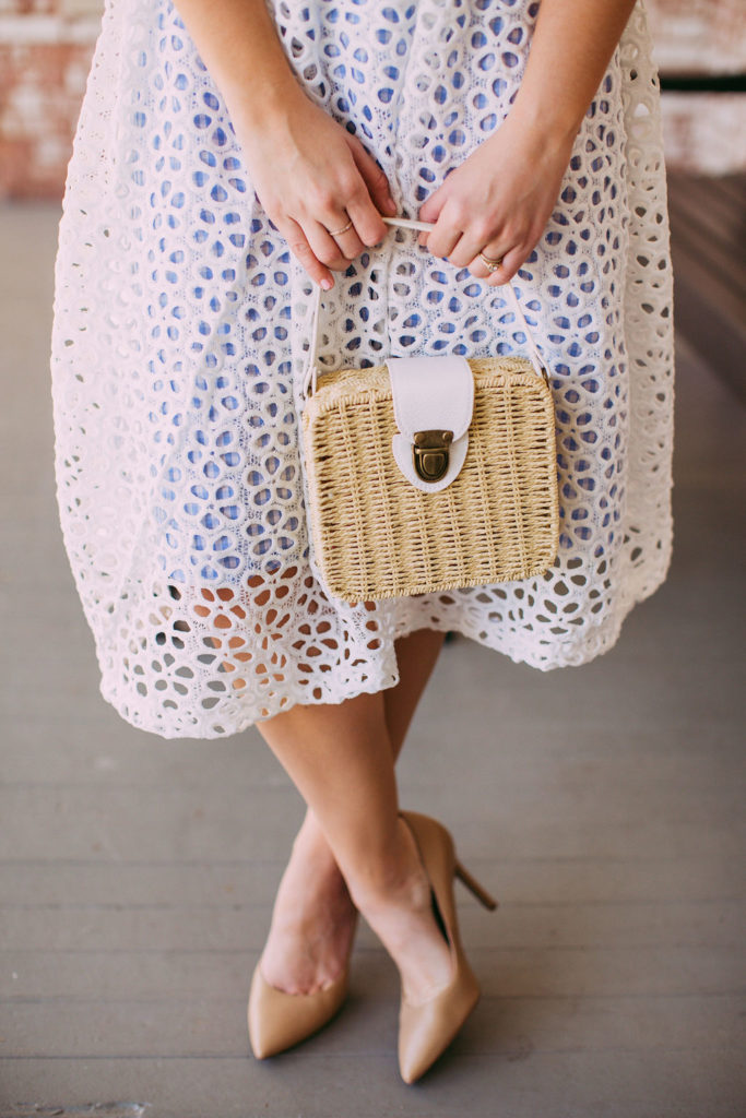 I paired this dress with nude heels, simple pearl earrings, and a wicker basket to tie in the whole Spring look.