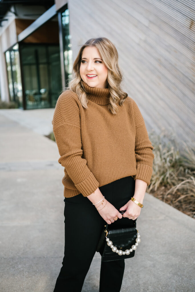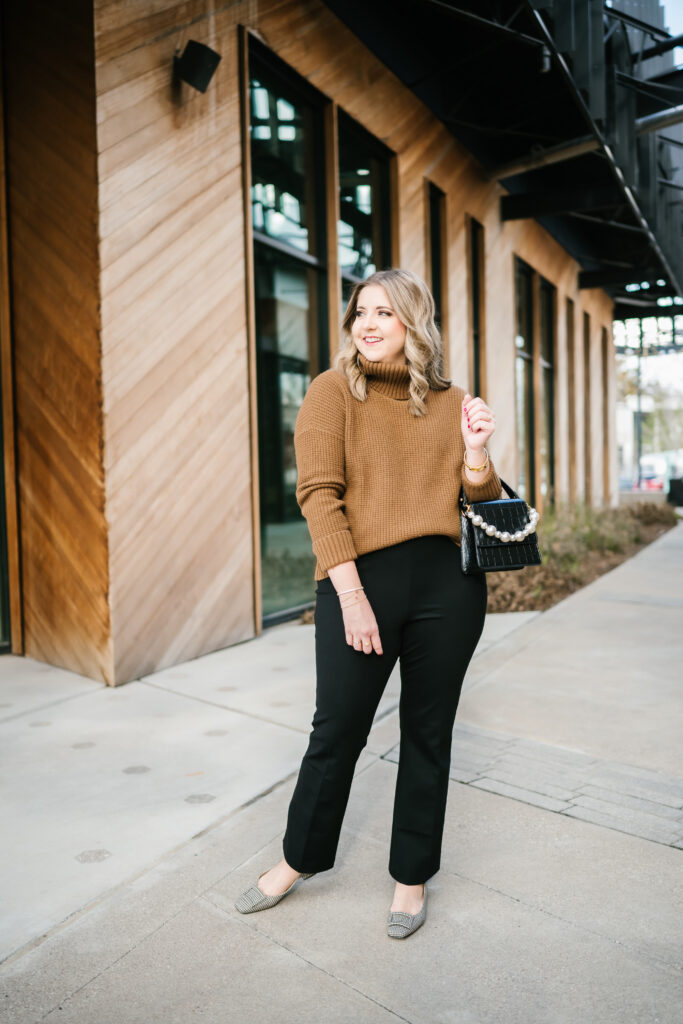 As we’re in the thick of winter and according to Punxsutawney Phil we’re going to have 6 more weeks of winter, it may be time to rethink your workwear wardrobe and upgrade it for the colder weather while things are being discounted. A classic winter workwear outfit should not only be warm and cozy, but also stylish and professional. That’s why I’ve put together a classic winter workwear outfit inspiration featuring a camel chunky turtleneck sweater, black work pants, and houndstooth printed flats.