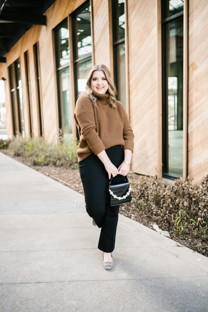 As we’re in the thick of winter and according to Punxsutawney Phil we’re going to have 6 more weeks of winter, it may be time to rethink your workwear wardrobe and upgrade it for the colder weather while things are being discounted. A classic winter workwear outfit should not only be warm and cozy, but also stylish and professional. That’s why I’ve put together a classic winter workwear outfit inspiration featuring a camel chunky turtleneck sweater, black work pants, and houndstooth printed flats.